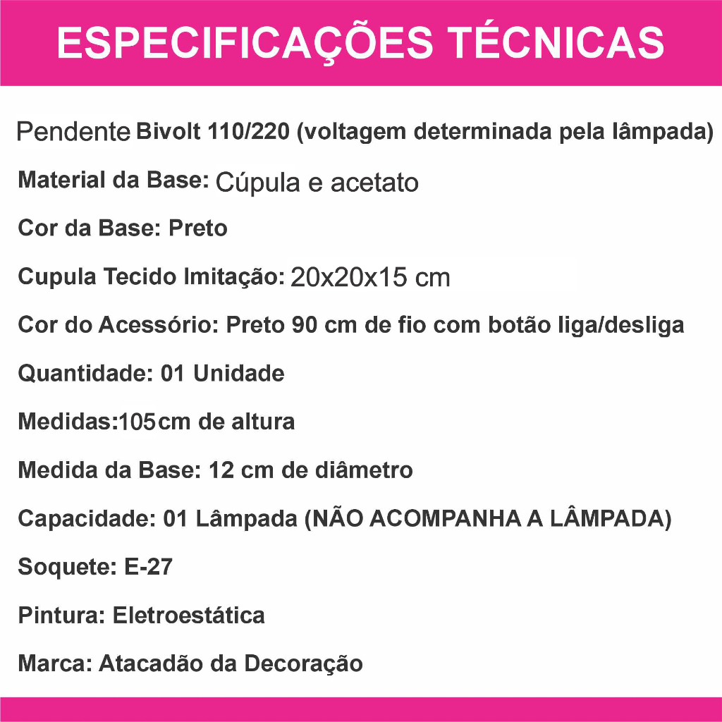 PENDENTE Luminaria Bivolt (voltagem determinada pela lâmpada) Modelos Lâmpada: G45, E12, E14 Cúpula Ferro e Tecido: 15x 20 x 15 cm TECIDO: IMITAÇÃO Cor do Acessório: Fio branco 90 cm Quantidade: 01 Unidades Medidas: 20 cm altura Capacidade: 1 Lâmpadas (NÃO acompanha as lâmpadas) Soquete: E-27 Pintura eletrostática Marca: ATACADÃO DA DECORAÇÃO Pode-se usar com qualquer lâmpada até 60w. Ficamos à disposição para responder qualquer dúvida. Respondemos imediatamente. ** A montagem do produto fica sob responsabilidade do COMPRADOR.** ** Verificar os dados do pedido e especificações pois não é possível alterá-los após a efetuação da compra, tendo que cancelar a compra (caso não tenha saído para entrega) ou realizar um novo pedido.** *Imagens meramente ilustrativas, podem existir divergência entre as cores reais dos produtos e as cores apresentadas na tela, pois podem variar dependendo da configuração do seu monitor.* Não Acompanha Lâmpada