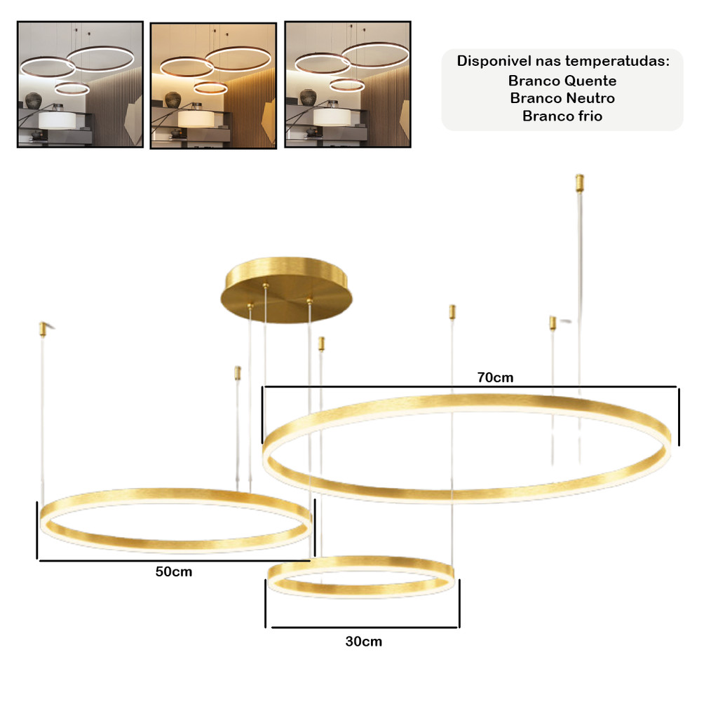 Pendente Lustre Led 3 Anéis Arco de Ouro Luxo Moderno 3 Cores de Luz Luminária Suspensa Bivolt