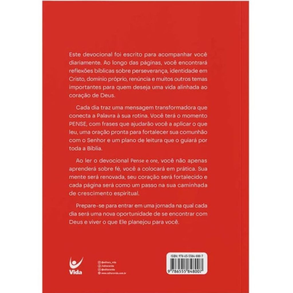 Este devocional foi escrito para acompanhar você diariamente. Ao longo das páginas, você encontrará reflexões bíblicas sobre perseverança, identidade em Cristo, domínio próprio, renúncia e muitos outros temas importantes para quem deseja uma vida alinhada ao coração de Deus.Cada dia traz uma mensagem transformadora que conecta a Palavra à sua rotina. Você terá o momento PENSE, com frases que ajudarão você a aplicar o que leu, uma oração pronta para fortalecer sua comunhão com o Senhor e um plano de leitura que o guiará por toda a Bíblia.Ao ler o devocional Pense e ore, você não apenas aprenderá sobre fé, você a colocará em prática. Sua mente será renovada, seu coração será fortalecido e cada página será como um passo na sua caminhada de crescimento espiritual.Prepare-se para entrar em uma jornada na qual cada dia será uma nova oportunidade de se encontrar com Deus e viver o que Ele planejou para você. Título: Pense e Ore 2026 | Devocionais que tiram a fé da teoria | Autor: Diego Menin Número de páginas: 380 Dimensões: Larg. 16 X Alt. 22 Acabamento: Capa comum brochura Editora: Vida