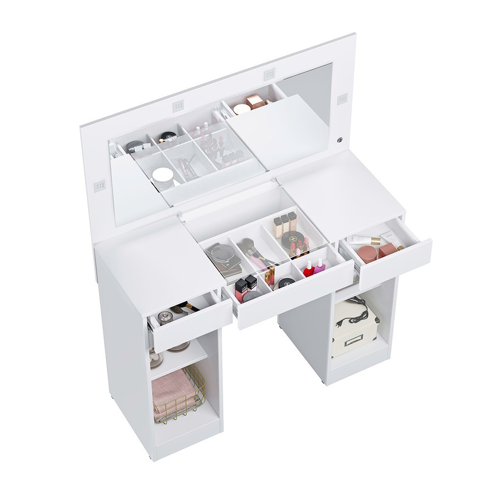 A Penteadeira Camarim Studio é ideal para quem procura praticidade. Possui duas gavetas laterais e uma central com tampo de vidro que permite visualizar seus pertences e divisórias organizacionais. Além de dispor 4 leds para auxiliar na produção do dia a dia. Características: Estrutura MDP Tampo com visor de vidro Gaveta central com corrediça telescópica e divisórias organizacionais 4 luminárias de led Espelho incluso 0,86x0,38m Dimensões: Altura: 133 cm Largura: 105 cm Profundidade: 40 cm Peso: 37,7 kg Garantia do fornecedor de 3 meses.