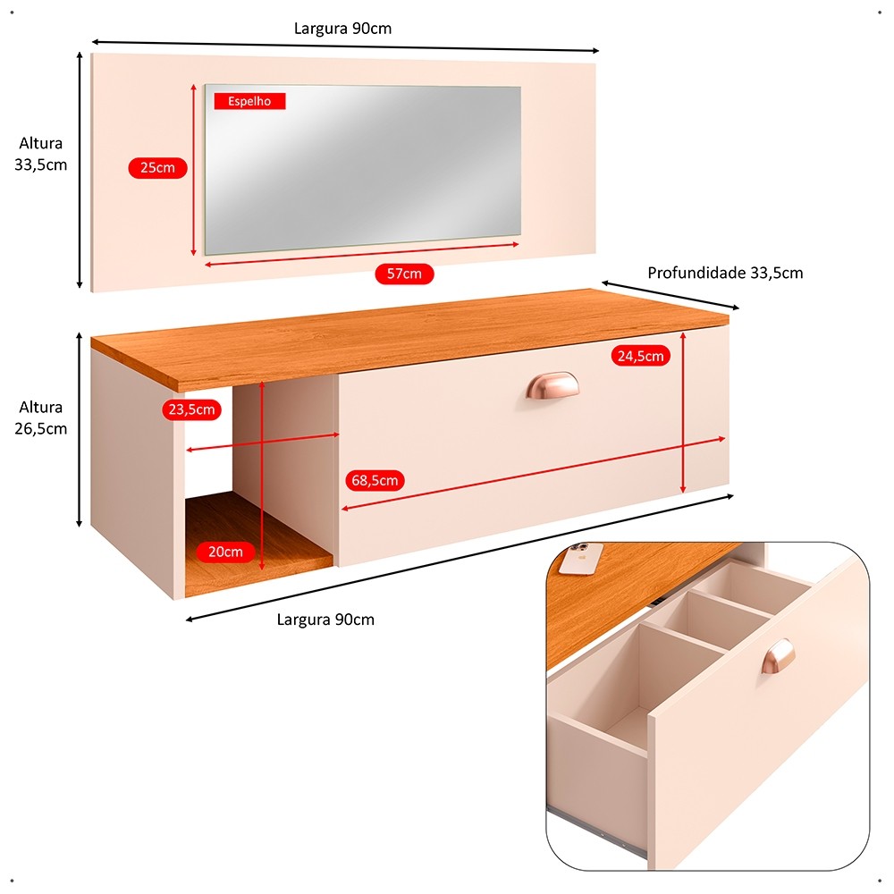 Penteadeira Camarim Suspensa MAKE UP Joy Com Gaveta Nichos E Espelho - GM Móveis