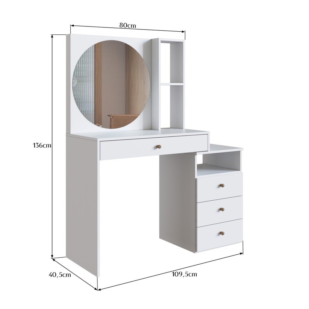 A Penteadeira ES2002 possui espelho redondo, 3 nichos e 4 gavetas que são ideais para você guardar seus produtos de beleza, maquiagens, perfumes e demais itens! Seus pertences vão ficar muito bem separados e organizados nas gavetas e nichos desta linda espelheira! Estilo: Moderno Peso (kg): 24.5 Garantia: 03 Meses Altura (cm): 136 Acabamento: Finish Foil Largura (cm): 109.5 Possui Pés: Não Possui Vidro: Não Possui Portas: Não Possui Gavetas: Sim Possui Moldura: Não Suporta Até (kg): 25 Possui Espelhos: Sim Profundidade (cm): 40.5 Escala de Brilho: Fosco Gaveta com Chave: Não Serviço Montagem: 114259443 Tampo Basculante: Não Origem do Produto: Nacional Possui Iluminação: Não Acompanha Banqueta: Não Ambiente Principal: Quarto Formato do Espelho: Redondo Material da Gaveta: MDP Material Principal: MDP Possui Prateleiras: Sim Sapatas Niveladoras: Não Acabamento da Gaveta: Finish Foil Possui Porta Objetos: Não Material da Prateleira: MDP Peso Máximo por Gaveta: 5 Quantidade de Espelhos: 1 Acabamento da Prateleira: Finish Foil Tipo de Puxador da Gaveta: Externo Escala de Brilho da Gaveta: Fosco Peso Máximo por Prateleira: 7 Tipo de Corrediça da Gaveta: Metálica Telescópica Material do Puxador da Gaveta: Madeira Maciça Escala de Brilho da Prateleira: Fosco Marca: Prodecor Cor Flex: Não Cor Interna: Branco Cor do Produto: Branco Itens Inclusos: 1 Penteadeira e Manual de Montagem Cor Predominante: Branco Linha ou Coleção: quarto Cor do Puxador: Marrom