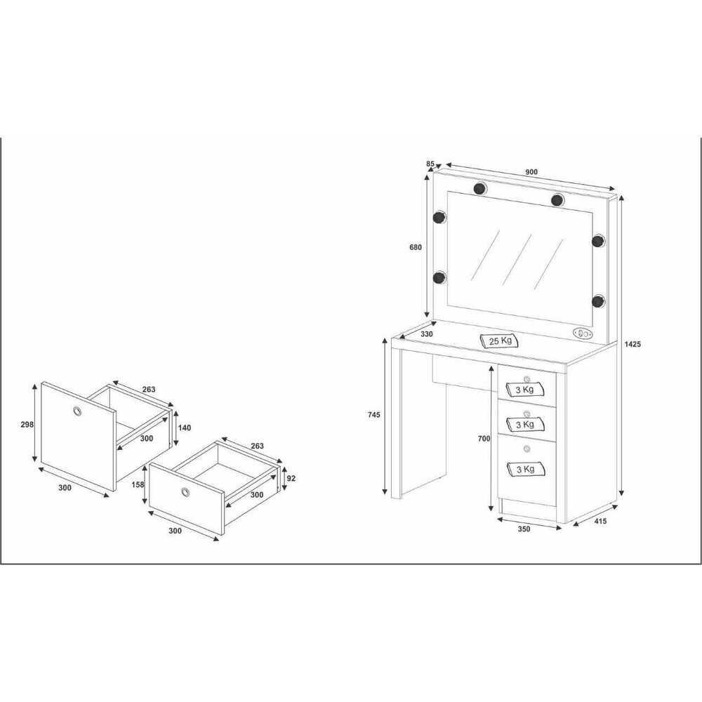 A Penteadeira com Espelho 3 Gavetas Multimóveis, funcional e elegante, é indispensável na hora de se cuidar. Possui 3 gavetas, sendo uma maior, espelho, bocais para 6 lâmpadas, chicote elétrico, estrutura em MDP e acabamento em pintura UV. Compacta e funcional, permite acomodar diversos itens e acessórios de forma rápida, facilitando muito na hora de sua utilização. Conteúdo da Embalagem: Penteadeira Manual de Montagem Kit Ferragem Dimensões do produto montado: Altura: 142,5cm | Largura: 90cm | Profundidade: 41,5cm *Você pode consultar as medidas internas na imagem técnica do produto. *As cores do produto podem sofrer variações de tonalidade de acordo com as configurações do seu dispositivo. Imagem meramente ilustrativa. Decoração não acompanha o produto. O produto será entregue desmontado e não disponibilizamos o serviço de montagem.
