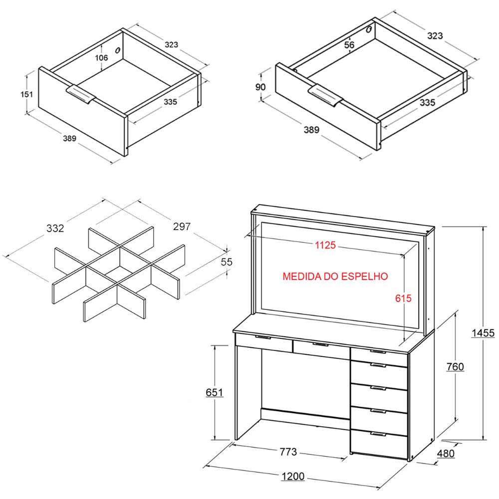 Sinta-se como uma estrela de cinema! A espetacular Penteadeira com Iluminação Camarim Ditália traz um estilo limpo e moderno para o seu quarto. Fabricada em madeira MDP UV com bordas melamínicas brancas, a penteadeira possui 7 gavetas onde você pode guardar tudo o que precisa para o seu dia a dia. De joias a documentos, seu ambiente ficará muito mais organizado e lindo. A base superior da mesa é ideal para guardar lembranças e recordações, trabalhar no seu notebook e divertir-se muito no espelho. Sinta-se em uma estrela! CARACTERÍSTICAS - Acabamento em UV branco acetinado. - Borda melamínica. - Produzido em MDP 15 mm. - Acompanha kit de iluminação camarim. - A base superior da mesa suporta até 20 kg e as prateleiras suportam até 5 kg. - Possui 7 gavetas com corrediças metálicas. - Penteadeira com 1 espelho incluso. - Possui 2 divisores de joias/objetos com 9 posições cada INFORMAÇÕES TÉCNICAS - Peso: 48,14 kg - Altura: 145,50 cm - Largura: 120 cm - Profundidade: 48 cm - Acompanha kit ferragens e manual de montagem (montagem não inclusa). - Este produto é vendido desmontado em 3 volumes embalado em caixa de papelão com isopor nas laterais e revestidos com plásticos termoencolhível. - A Fixação é feita por minifix e parafusos, não é necessário parafusar na parede. ITENS DO KIT LUZ CAMARIM - 10 lâmpadas de LED de 1,6 W. - 1 cabo USB de 4 metros. - 1 interruptor dimmer. - 20 adesivos dupla face para fixação no espelho. ESPECIFICAÇÕES DO KIT LUZ CAMARIM - Brilho ajustável. - 3 tipos de cores ajustáveis: branco frio, branco quente e branco luz natural do dia. - Potência máxima de cada lâmpada: 1,6 W. - Regulagem entre 15 e 33 cm entre as lâmpadas. - Tamanho da lâmpada: 5,1 x 4,5 cm. - Fonte de alimentação: USB. CARACTERÍSTICAS DO KIT LUZ CAMARIM - De brilho suave, as lâmpadas de LED não ofuscam os olhos e proporcionam uma iluminação profissional para maquiagem. - O cabo USB pode ser ajustado de acordo com a fixação das lâmpadas no espelho. - As lâmpadas são fixadas com adesivo dupla face. - Com o interruptor dimmer é possível ligar/desligar as luzes, ajustar o brilho, ajustar as cores/tons das luzes, conforme preferência. INSTALAÇÃO DO KIT LUZ CAMARIM - A lâmpada LED deve ser fixada no espelho pela parte de trás com os adesivo dupla face. - O kit de lâmpadas LED deve ser ligado na tomada elétrica através de adaptador de carregador de celular. Também é possível ligá-lo no carregador portátil ou ainda na saída USB do computador ou notebook. PERGUNTAS FREQUENTES 1 - O produto é entregue montado? Resposta: Nossos produtos são entregues desmontados. Os móveis são acompanhados de todos componentes necessários (manual de montagem, parafusos, pregos, puxadores e etc..) para que possam ser montados com facilidade. 2 - Vocês oferecem serviço de montagem? Resposta: Não disponibilizamos este serviço. 3 - Qual o valor da entrega? Resposta: O valor referente à entrega dependerá do destino final da mercadoria, para calcular o valor, é considerado o CEP do consumidor. 6 - O espelho possui iluminação? Resposta: Sim, acompanha o kit de iluminação camarim. 7 - O divisor de objetos/jóias acompanha o produto? Resposta: Sim, os 2 divisores de joias/objetos acompanha o produto. LIMPEZA Limpar utilizando apenas pano umedecido com água, nunca utilizar abrasivos ou esponjas de aço. GARANTIA Garantia de 3 meses (contra defeito de fabricação). OBSERVAÇÕES - Montar o móvel deitado de costas. - Forrar o chão com o papelão das embalagens, aconselhamos ser feita por um profissional, não expor o móvel a fontes de calor ou de umidade. - As imagens indicam uma sugestão de uso e são apenas ilustrativas, os objetos decorativos não estão inclusos.