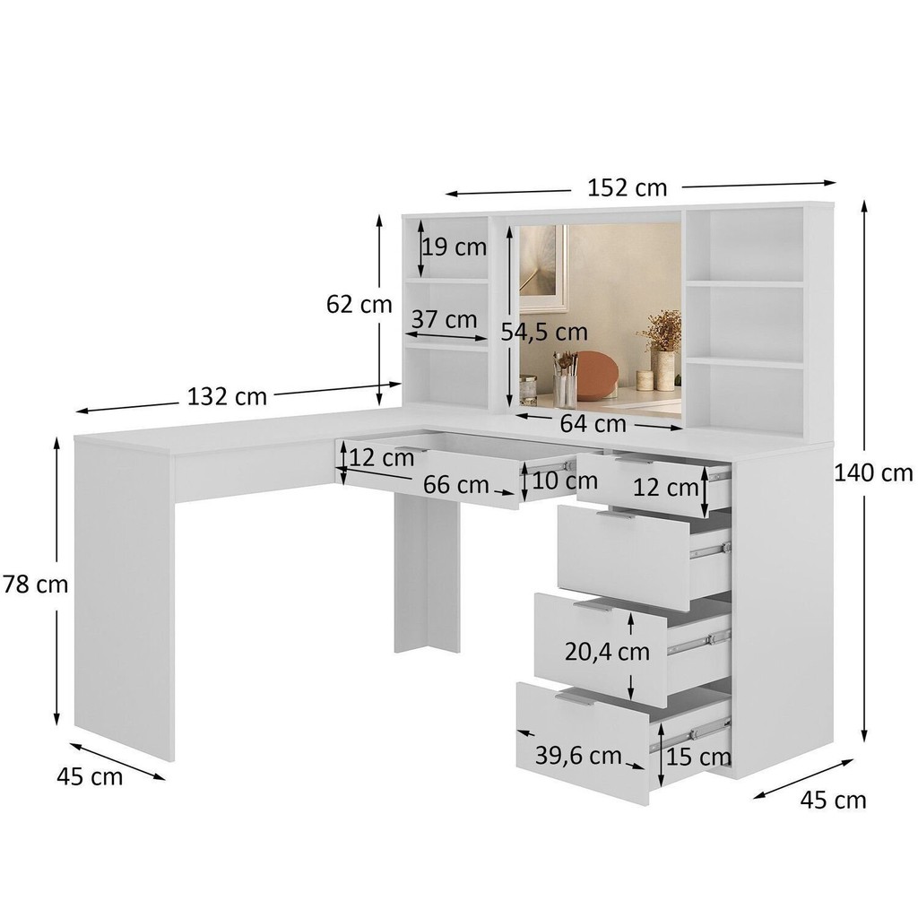 Penteadeira Escrivaninha em L com Espelho Led 5 Gavetas 6 Nichos