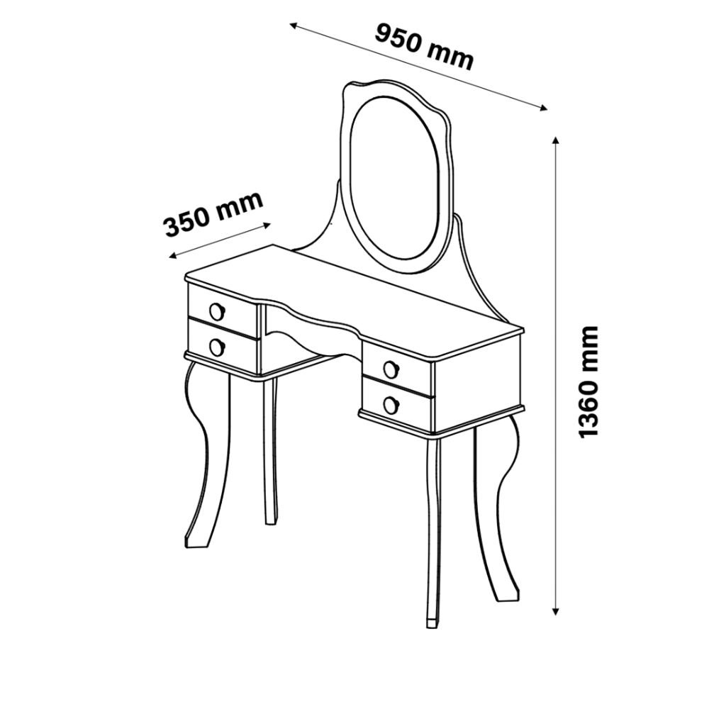 Características<br><br> Marca: Patrimar<br> Modelo: Princesa<br> Largura: 95 cm<br> Altura: 136 cm<br><br> Descrição<br><br> Acabamento : Pintura UV<br><br> Acompanha Manual de Instalação : Sim<br><br> Altura : 136 cm<br><br> Largura : 95 cm<br><br> Profundidade : 35 cm<br><br> Ambiente : Quarto<br><br> Estilo : Moderno<br><br> Garantia do Fornecedor : 03 meses<br><br> Gaveta com Chave : Não<br><br> Itens Inclusos : 1 Penteadeira, 1 Manual de montagem <br><br> Material : MDP<br><br> Material da Gaveta : MDP<br><br> Material Principal : MDP<br><br> Necessita Montagem : Sim<br><br> Peso : 70 kg<br><br> Peso Máximo por Gaveta : 3 kg<br><br> Possui Espelho : Sim<br><br> Possui Gavetas : 04<br><br> Possui iluminação : Não<br><br> Possui Moldura : Não<br><br> Possui Pés : 04<br><br> Possui Banqueta: Sim <br><br> Recomendações de Uso, Manutenção e Limpeza : Utilize um pano macio umedecido com água e sabão neutro, seguido de pano seco. Não utilize produtos químicos ou abrasivos para limpeza, pois estes danificam o revestimento do móvel. <br><br> Sapatas Niveladoras : Não<br><br> Sistema de Montagem : Cavilhas, Parafusos e Pregos. <br><br> Suporta até (kg) : 10 kg<br><br> Tipo de Puxador da Gaveta : Externo<br><br> INFORMAÇÕES IMPORTANTES:<br><br> - Os objetos que ambientam as fotos não acompanham o produto;<br> - O produto será entregue desmontado;<br> - É de inteira responsabilidade do cliente a montagem do produto e/ou instalação, custos de transporte por escadas e/ou elevadores, guincho ou içamento, assim como possíveis avarias provenientes de manuseio inadequado;<br> - Embora o produto acompanhe o manual de montagem, verifique a complexidade antes de decidir montá-lo sozinho, recomendamos que contrate um profissional de sua confiança;<br> - Fique atento, nossas cores podem sofrer alterações dependendo do seu monitor;<br> - ANTES DE MONTAR O SEU PRODUTO, certifique-se que todas as instruções dispostas no manual, bem como todas as ferragens descritas, estejam presentes dentro da embalagem. Verifique se há alguma peça avariada, caso esteja, prestaremos a devida assistência dentro do prazo da garantia.