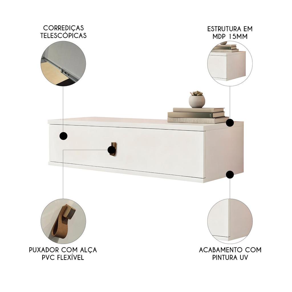 Penteadeira Suspensa 90cm 1 Gaveta Quarto Lila Branco Z49 - Mpozenato A Gaveta Suspensa é perfeita para quem busca praticidade sem abrir mão do estilo. Com seu design elegante, ela valoriza o ambiente e otimiza o espaço, trazendo um toque sofisticado e funcional para o dia a dia. Produzida em MDP de alta qualidade, essa peça oferece resistência e durabilidade, garantindo um móvel que vai acompanhar sua rotina por muito mais tempo. O acabamento elegante contribui para compor um visual harmonioso em qualquer Quarto. Conta com uma gaveta ampla que desliza suavemente graças à corrediça telescópica, ideal para organizar maquiagens, acessórios e objetos pessoais. Seu puxador discreto em PVC flexível, proporciona um detalhe diferenciado e cheio de charme. Versátil e funcional, a Penteadeira Suspensa Elegante pode ser instalada de forma prática, deixando o ambiente mais leve e organizado, perfeita para transformar a rotina com beleza e praticidade. ESPECIFICAÇÕES Dimensões do Produto Largura: 90 cm. Altura: 23 cm. Profundidade: 33 cm. Peso: 13,4 Kg. Características do Produto Material da Estrutura: MDP 15mm. Peso Suportado: 8 Kg distribuídos. Acabamento: Pintura UV. Escala de Brilho: Brilho. Possui Gaveta: Sim. Quantidade de Gavetas: 1 Gaveta. Tipo das Corrediças: Telescópicas. Possui Puxador: Sim. Material dos Puxadores: Alça em PVC flexível. Possui Espelho: Não. Possui Pés: Não. Diferenciais: - Design elegante. - Estrutura 100% MDP. - Gaveta com corrediça telescópica. - Puxador com alça em PVC flexível. Sistema de Montagem: Cavilhas/Parafusos/Pregos. Manual de Montagem: Sim. Complexidade da Montagem: Médio. Volumes: 1 Volume. Conteúdo da Embalagem: 1 Penteadeira. Garantia do Fabricante: 90 dias contra defeito de fabricação. Montagem: Recomendamos que seja feita por um profissional. Recomendação de Limpeza: Utilize pano úmido. Observações importantes: - Produto para uso residencial em ambiente interno, não devendo ficar exposto diretamente ao sol, calor e umidades excessivas. - Pode haver alguma diferença de tonalidade entre a imagem e o produto real, por conta do tratamento de imagens e a calibração de cores do seu monitor. - As imagens são meramente ilustrativas, não acompanham objetos de decoração e eletrônicos. - Confira o estado da embalagem, não devendo assinar o comprovante em caso de danos. - Não asseguramos, no ato da entrega, por subir escadas/elevadores, pelo transporte por guincho em apartamentos ou montagem, desmontagem e instalações. Eventuais despesas são por conta do comparador. - Confira as dimensões do produto e certifique-se de que passará normalmente por supostos elevadores, portas, escadas e/ou corredores de sua residência.