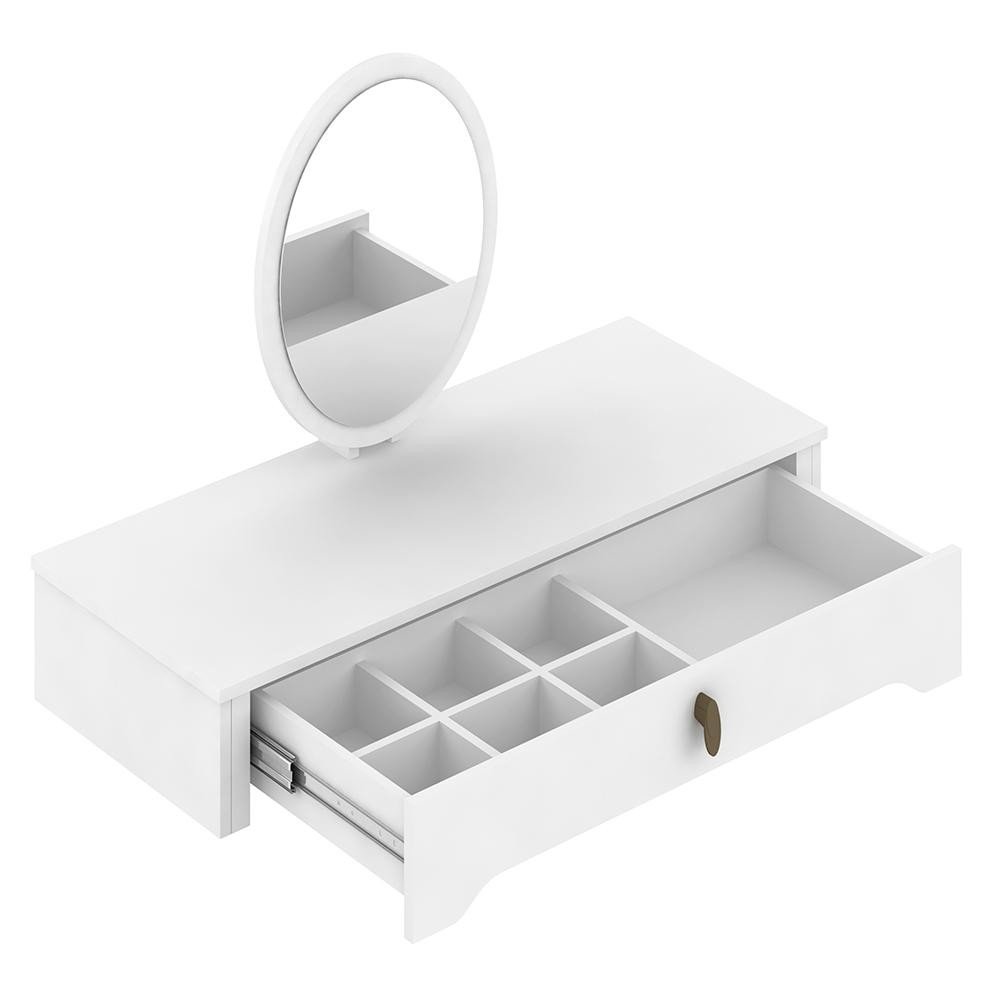 A Penteadeira Suspensa Paola é uma ótima opção para quem busca deixar o ambiente mais romântico e delicado, fabricado com materiais de qualidade, é o produto perfeito para o seu cantinho! Detalhes Técnicos: Medidas da Penteadeira Montada: A: 64,5cm | L: 91cm | P: 36cm Medidas do Espelho: A: 40cm | L:35cm Materiais de Fabricação: - Material MDP - Corrediça Metálica - Revestimento: Pintura UV - Tonalidade: Branco - Peso Suportado pela gaveta: 5kg - Estruturado com material de altíssima qualidade, evitando fungos e mofo. Conteúdo da Embalagem: - 01 Penteadeira - Caixa papelão - Acessório para Montagem: Cavilhas, Parafusos, Sache de cola, Etiqueta, Tapa furo. Observações Importantes: - Imagens ambientadas meramente ilustrativas, objetos decorativos não compõe o produto; - Produto novo, garantia somente para defeitos de fabricação: 3 meses; - Não realizamos entregas em zonas rurais, via caminhos fluviais e distritos, NÃO ACEITAMOS CEP GERAL; - Não trabalhamos com entrega agendada. O recebedor deve ter mais de 18 anos. O valor do frete não inclui: subida de escada, elevador ou lançamento de produto, em condomínio residencial a entrega é feita somente até a portaria. As entregas são realizadas em dias e horários comerciais; - Ao receber o produto observe se a embalagem está em perfeita condição. Confira atentamente a quantidade de volumes; - Produto entregue desmontado. É responsabilidade do cliente a montagem/instalação do produto, inclusive despesa para sua realização. Recomendamos a contratação de um profissional especializado; - Evitar a exposição direta à luz solar e à umidade. Limpar com pano macio e seco, não utilizar produtos químicos; - A cor do produto pode variar de acordo com o monitor, a iluminação do ambiente ou sua percepção visual.
