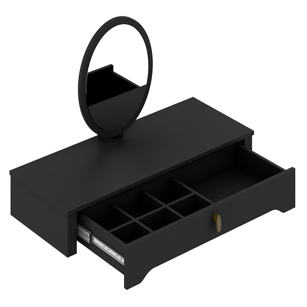 A Penteadeira Suspensa Pietra é uma ótima opção para quem busca deixar o ambiente mais romântico e delicado, fabricado com materiais de qualidade, é o produto perfeito para o seu cantinho! Detalhes Técnicos: Medidas da Penteadeira Montada: A: 64,5cm | L: 91cm | P: 36cm Medidas do Espelho: A: 40cm | L:35cm Materiais de Fabricação: - Material MDP - Corrediça Metálica - Revestimento: Pintura UV - Tonalidade: Preto Fosco - Peso Suportado pela gaveta: 5kg - Estruturado com material de altíssima qualidade, evitando fungos e mofo. Conteúdo da Embalagem: - 01 Penteadeira - Caixa papelão - Acessório para Montagem: Cavilhas, Parafusos, Sache de cola, Etiqueta, Tapa furo. Observações Importantes: - Imagens ambientadas meramente ilustrativas, objetos decorativos não compõe o produto; - Produto novo, garantia somente para defeitos de fabricação: 3 meses; - Não realizamos entregas em zonas rurais, via caminhos fluviais e distritos, NÃO ACEITAMOS CEP GERAL; - Não trabalhamos com entrega agendada. O recebedor deve ter mais de 18 anos. O valor do frete não inclui: subida de escada, elevador ou lançamento de produto, em condomínio residencial a entrega é feita somente até a portaria. As entregas são realizadas em dias e horários comerciais; - Ao receber o produto observe se a embalagem está em perfeita condição. Confira atentamente a quantidade de volumes; - Produto entregue desmontado. É responsabilidade do cliente a montagem/instalação do produto, inclusive despesa para sua realização. Recomendamos a contratação de um profissional especializado; - Evitar a exposição direta à luz solar e à umidade. Limpar com pano macio e seco, não utilizar produtos químicos; - A cor do produto pode variar de acordo com o monitor, a iluminação do ambiente ou sua percepção visual.