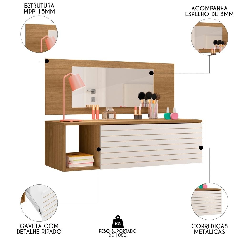 Penteadeira Suspensa com Painel e Espelho Joy P14 Nature/Branco - Mpozenato
