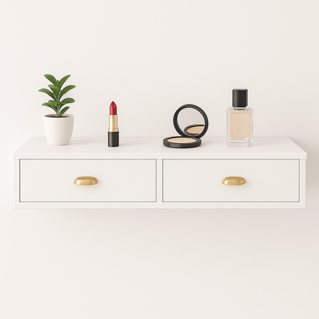 Penteadeira Suspensa com 2 Gavetas - 90x25x25cm Transforme seu ambiente com praticidade e elegância! Esta penteadeira suspensa compacta é ideal para espaços reduzidos, oferecendo funcionalidade sem abrir mão do estilo. ✔️ Medidas: 90 cm (largura) x 25 cm (altura) x 25 cm (profundidade) ✔️ Design moderno: tampo amadeirado com estrutura em bege claro ✔️ Organização garantida: 2 gavetas com puxadores metálicos dourados ✔️ Versátil: pode ser usada como penteadeira, estante suspensa ou aparador de parede ✔️ Fácil de instalar (fixação na parede – parafusos e buchas não inclusos) Ideal para quartos, closets, home office ou estúdios. Uma solução inteligente para quem busca otimizar o espaço com um toque de sofisticação. 🛒 Aproveite agora e leve mais charme para sua decoração!