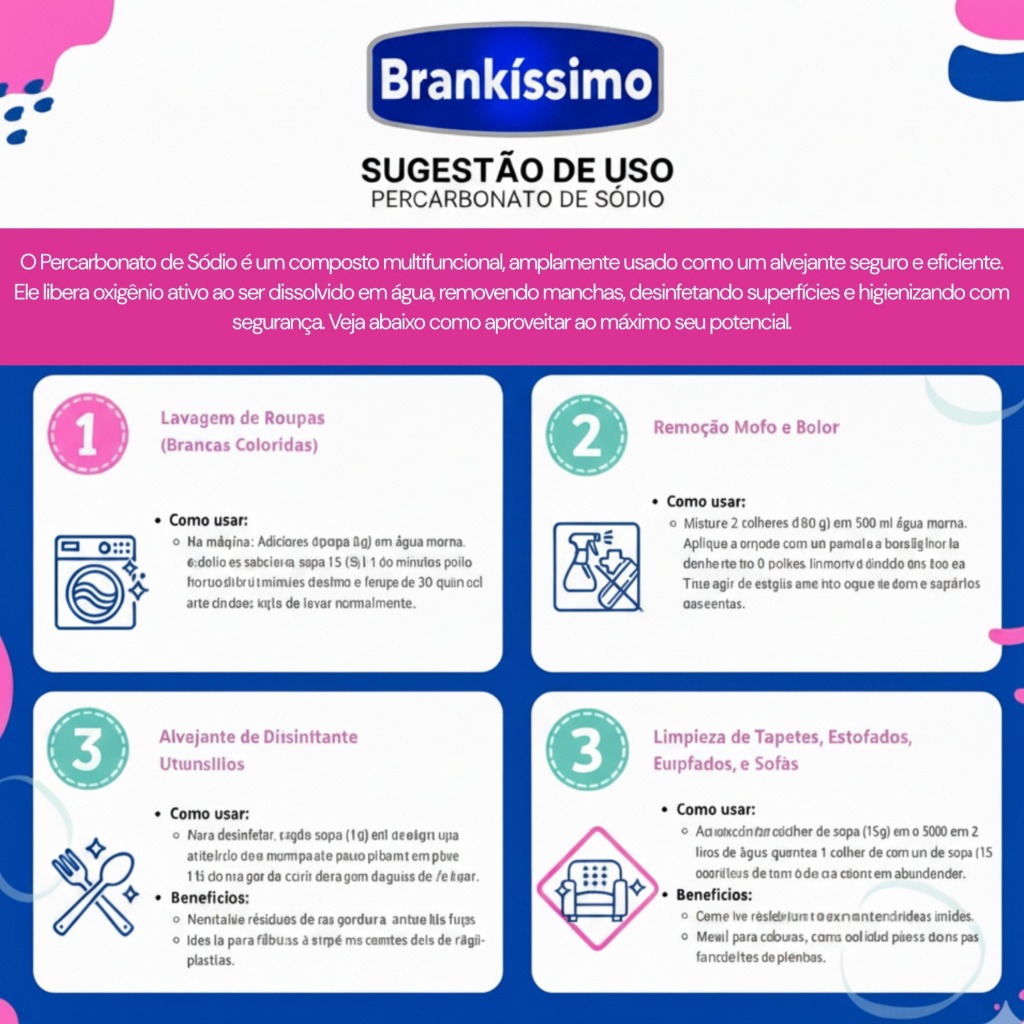| Percarbonato de Sódio 100% Puro Limpeza Em Geral Tira Manchas Roupa... | R$ 12,67 | 15% | 4.7/5 | 47 mil |