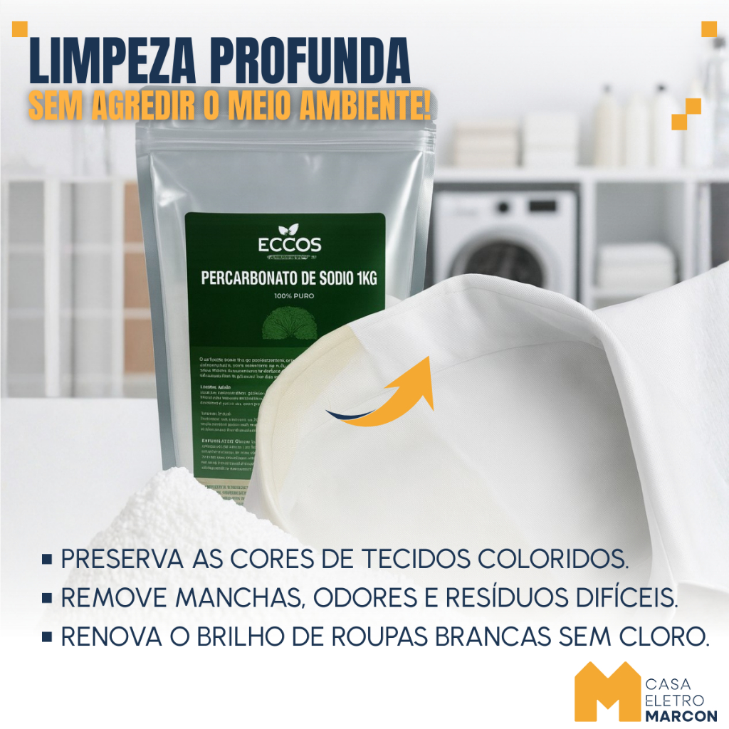PERCARBONATO DE SÓDIO ECCOS 100% PURO | EXTRA FINO | ALTA PERFORMANCE NA LIMPEZA Escolha a quantidade na variação: - 500G (Refil) - 1KG - 2KG O Percarbonato de Sódio ECCOS é um alvejante natural de alto desempenho, desenvolvido para quem busca máxima eficiência na remoção de manchas e higienização profunda. Sua granulação extra fina proporciona dissolução mais rápida e maior liberação de oxigênio ativo, garantindo resultados superiores em comparação aos produtos comuns do mercado. Indicado para roupas brancas e coloridas, oferecendo limpeza profunda sem danificar os tecidos. Prefira o uso com água quente com melhores resultados. *DIFERENCIAIS DO PERCARBONATO ECCOS: - 100% Puro, sem diluição ou misturas - Granulação extra fina, que acelera a ação de limpeza - Maior liberação de oxigênio ativo - Melhor desempenho em manchas difíceis - Ecologicamente seguro e sem cloro - Pode ser usado em roupas brancas e coloridas (com uso correto) - Produto premium com padrão profissional *BENEFÍCIOS PRINCIPAIS: - Remove manchas difíceis como suor, vinho, sangue, gordura e alimentos - Recupera o branco original das roupas - Mantém e reaviva cores - Elimina odores profundamente impregnados - Higieniza tecidos em profundidade - Excelente para panos de prato, toalhas, cama e banho - Também indicado para superfícies como rejuntes, pisos e azulejos *MODO DE USO: **Pré-lavagem (manchas difíceis): - Diluir 15 g (1 colher de sopa) em 1 litro de água quente. - Deixar a peça de molho por até 30 minutos antes da lavagem. **Lavagem na máquina: - Adicionar de 1 a 2 colheres de sopa (15 a 30 g) diretamente no tambor da máquina, junto ao sabão comum. Para melhor desempenho, utilizar água quente. *PRECAUÇÕES: - Realizar teste prévio em pequena área do tecido - Não utilizar em lã, seda, couro, lycra ou roupas com bordados - Não misturar com produtos à base de cloro - Evitar contato com olhos e pele - Não ingerir - Manter fora do alcance de crianças e animais *INFORMAÇÕES TÉCNICAS: - Composição: Percarbonato de Sódio - Pureza: 100% - Granulação: Extra Fina - Origem: Brasil - Validade: 24 meses ECCOS - Smart Clean - Linha premium de limpeza com foco em performance, segurança e sustentabilidade.