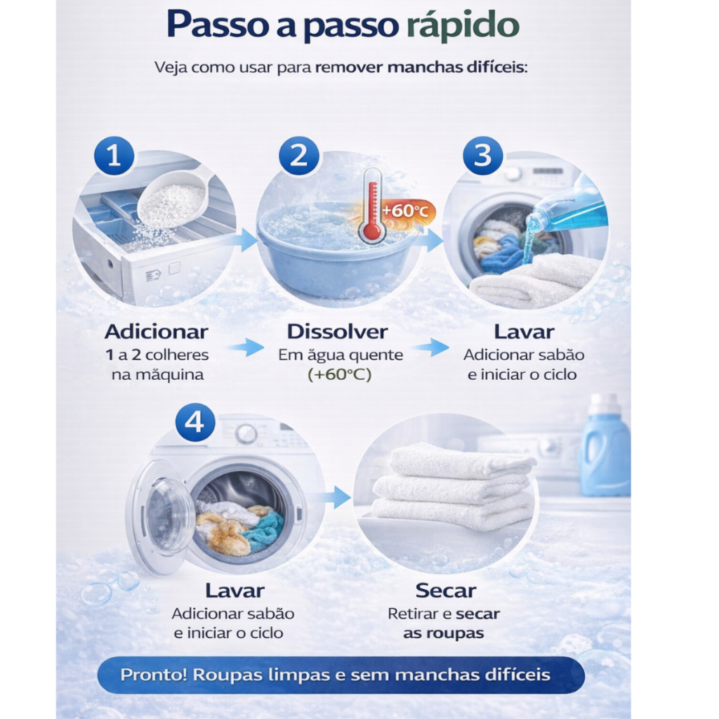 Alvejante com Percarbonato de Sódio Chega de manchas difíceis e cheiros fortes de cloro! O Alvejante com Percarbonato de Sódio é a solução perfeita para quem quer roupas brancas impecáveis e coloridas sem desbotar. Ele limpa profundamente, elimina odores e ainda desinfeta, deixando tudo mais seguro e livre de germes. Por que escolher o Percarbonato de Sódio? - Remove manchas difíceis como vinho, café, sangue e suor. - Não contém cloro, evitando amarelamento ou desbotamento das roupas. - Ideal para roupas brancas e coloridas resistentes. - Limpa e desinfeta pisos, rejuntes, banheiros, estofados e utensílios domésticos. - Odor neutro não deixa cheiro forte como o cloro. - É biodegradável e muito mais amigo do meio ambiente. - Libera oxigênio ativo que potencializa a limpeza mesmo em água morna ou quente. Como Usar - Para roupas: dissolva 1 a 2 colheres de sopa (30-60g) em 5 litros de água morna ou quente. - - - Deixe de molho por 30 minutos a 1 hora e lave normalmente. - Na máquina de lavar: coloque 1 a 2 colheres de sopa no compartimento do sabão ou sobre as roupas. Para melhores resultados, use água morna. - Para limpeza geral: dissolva 1 colher de sopa em 1 litro de água quente. Aplique com pano ou esponja, esfregue e enxágue. Cuidados: não misture com produtos à base de cloro. Guarde em local seco e longe do alcance de crianças e animais. Faça sempre um teste em tecidos coloridos antes do uso. Evite em lã, seda, couro ou tecidos delicados. Perfeito Para Roupas em casa limpa, lavanderias, profissionais de limpeza e qualquer pessoa que queira roupas mais brancas, coloridas vivas e ambientes limpos sem prejudicar o meio ambiente. O Alvejante com Percarbonato de Sódio é sinônimo de praticidade, eficiência e cuidado com a sua família e o planeta.