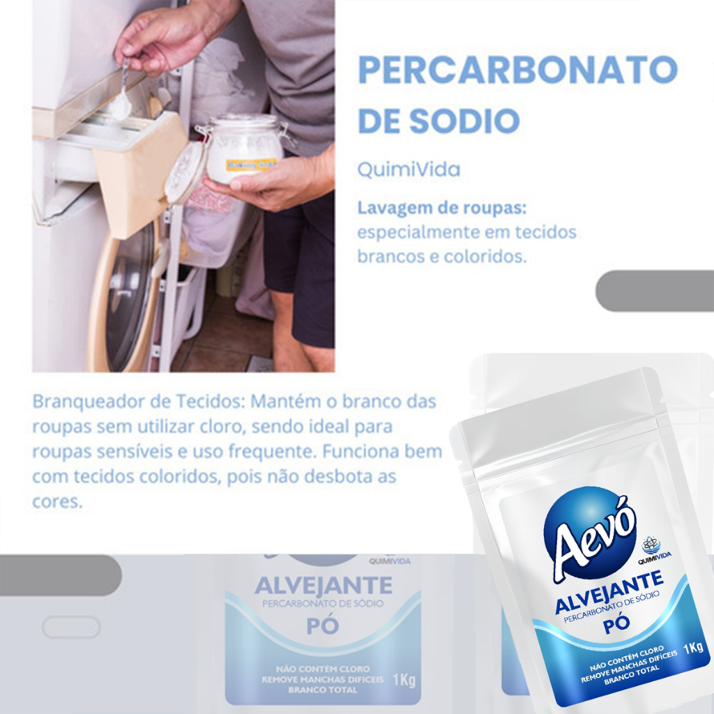 Percarbonato, de Sódio - Alvejante Tira Manchas Aevó 1kg Embalagem: 1kg Obs: Produto formulado para excelente performance na remoção de manchas e clareamento, ideal para quem busca resultados rápidos e eficientes. O Aevó Quimivida é um potente aliado na limpeza doméstica, especialmente no cuidado com roupas. Quando ativado em água quente, libera oxigênio ativo que potencializa a remoção de manchas, inclusive nas lavagens em máquina. Perfeito para deixar roupas de molho, age profundamente sem necessidade de esfregar ou usar produtos abrasivos. Além das roupas, também higieniza superfícies e objetos diversos. É eficaz na desinfecção de utensílios de cozinha, na remoção de manchas de café e chá em xícaras, na limpeza de tábuas de corte e no clareamento de rejuntes de azulejos. Sua ação efervescente também auxilia na limpeza de carpetes e estofados, penetrando nas fibras e soltando a sujeira. Escolher o Aevó Quimivida é investir em praticidade, eficiência e cuidado para sua casa e para o meio ambiente. Após a sua compra, caso queira nos contatar, não é necessário abrir reclamação. Fale conosco pelo campo Mensagens e resolveremos rapidamente sua situação. Dúvidas? Estamos à disposição. OFERECEMOS EMBALAGENS DE TRANSPORTE SEGURAS. PRODUTOS CERTIFICADOS