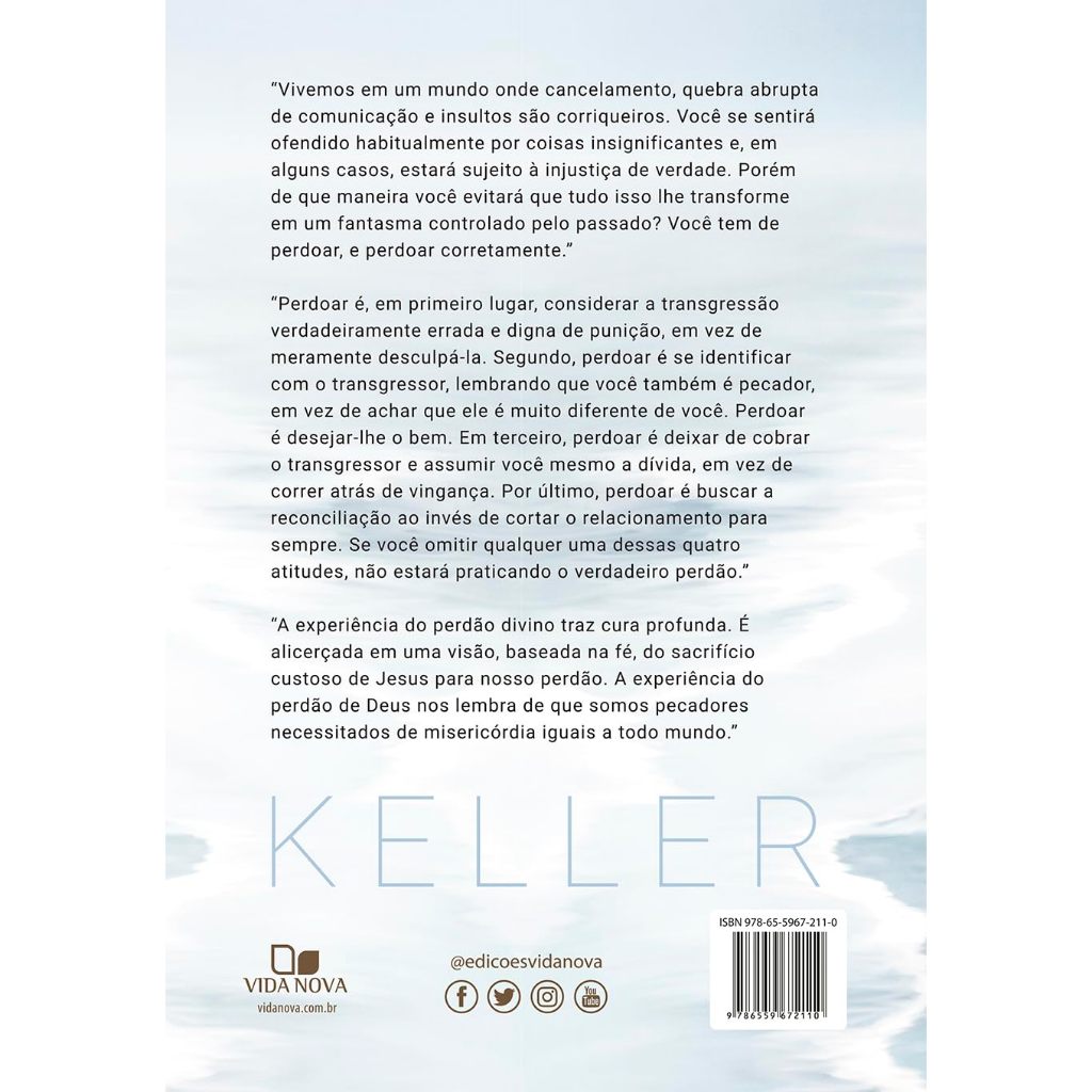 📝 Descrição: Perdoar – Por Que Devo e Como Posso?, escrito por Timothy Keller, é uma reflexão teológica e pastoral sobre o perdão como prática essencial da vida cristã. Nesta obra, Keller apresenta: • Fundamentos bíblicos do perdão, com base na graça e na justiça de Deus • Respostas às objeções culturais, como a ideia de que perdoar é fraqueza ou que compromete a justiça • Orientações práticas para perdoar ofensas profundas, sem negar a dor ou a necessidade de limites • Exemplos reais e insights pastorais, que ajudam o leitor a aplicar o perdão no cotidiano • Um chamado à reconciliação verdadeira, que liberta do ressentimento e promove cura interior 📄 Ficha técnica: Título: Perdoar – Por Que Devo e Como Posso? Autor: Timothy Keller Editora: Vida Nova ISBN: 9786559672110 Idioma: Português Número de páginas: 272 Formato: Brochura Dimensões: 23 cm x 16 cm Peso: Cerca de 500 g Categoria: Espiritualidade cristã, teologia pastoral, vida emocional Indicação etária: A partir de 16 anos 🔍 Palavras-chave: timothy keller, perdão cristão, vida nova, reconciliação, graça e justiça, cura emocional, espiritualidade, livro devocional, fé prática, como perdoar