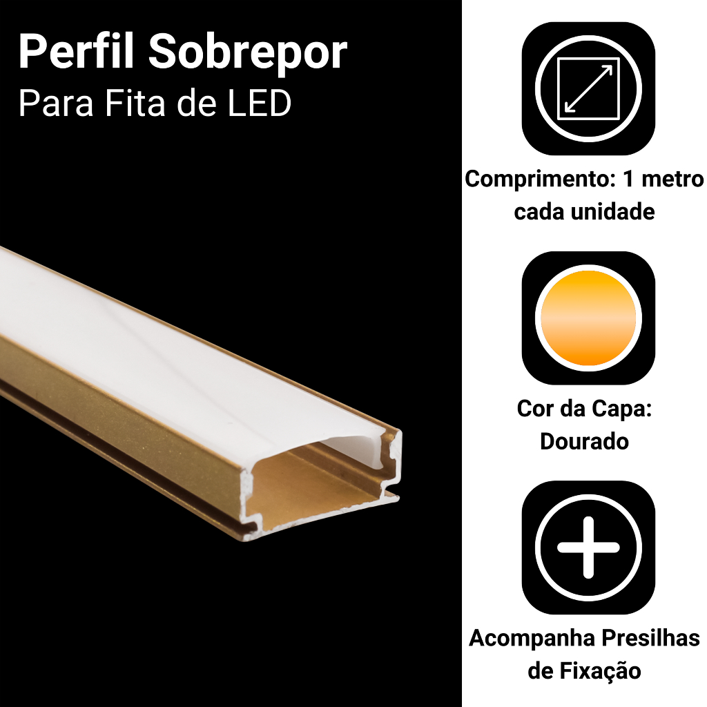 Perfil Dourado Alumínio Sobrepor Slim P/ Fita Led 1 Metro 2 Metros ou 5 Metros