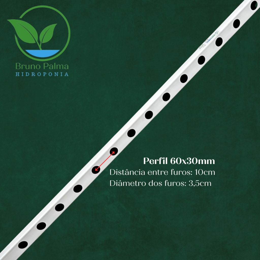 Perfil Hortivinyl 1.2m 60x30mm Capacidade para 12 plantas Material incluso: 1 Perfil Hortivinyl 60x30mm x 1.2m 1 tampa de entrada para perfil 1 tampa de saída para perfil Distância entre os furos: 10cm Diâmetro dos furos: 3,5cm Os Perfis Hortivinyl são industrializados 100% em material nobre o PVC, matéria prima de alta qualidade, durabilidade e desempenho. Todos perfis são feitos através do processo de co-extrusão, tendo a parte externa totalmente branca, auxiliando o perfil a absorver menos calor, diminuindo o aquecimento da solução nutritiva, facilita a limpeza do sistema e ajuda na reflexão da luz para as plantas. A parte interna preta e lisa, dificulta a entrada de luz dentro do sistema, desenvolvimento de algas e proliferação de doenças radiculares, auxilia no fluxo da solução nutritiva e limpeza dos perfis. O design exclusivo, favorece a estabilidade da bancada, reduzindo os indesejáveis desníveis entre os cavaletes, facilitando inclusive o processo de instalação, montagem e manutenção. A fabricação dos produtos utilizando 100% de resina de PVC, matéria prima nobre, possibilita oferecermos a maior garantia e qualidade do mercado, visando o melhor desempenho e durabilidade dos produtos no campo. O PVC é o material mais adequado para a produção de perfis, bancadas e acessórios para hidroponia, devido a sua alta resistência mecânica, fácil limpeza, atóxidade, ótima estabilidade térmica e durabilidade. O PVC trata-se de um material nobre e versátil, não havendo nenhuma contraindicação por parte da ANVISA – Agência Nacional de Vigilância Sanitária. Vantagens: A parte externa totalmente branca absorve menos calor, diminui o aquecimento da solução nutritiva, facilita na limpeza do sistema e auxilia na difusão de luz, ajudando no desenvolvimento da planta. A parte interna preta e lisa, dificulta o desenvolvimento de algas e proliferação de doenças, pois reduz a entrada de luz no sistema. Além de auxiliar no fluxo da solução nutritiva e na limpeza dos perfis. Seu design exclusivo favorece a estabilidade da bancada, reduzindo os indesejáveis desníveis entre os cavaletes, facilitando o processo de instalação, montagem e manutenção. Proporciona também um sistema altamente resistente, sem vazamento e com alta eficiência produtiva. A parte interna inferior do perfil possui um ângulo específico, ao qual serve para direcionar o fluxo da solução nutritiva, garantindo que a solução passe por todas as plantas de forma uniforme.