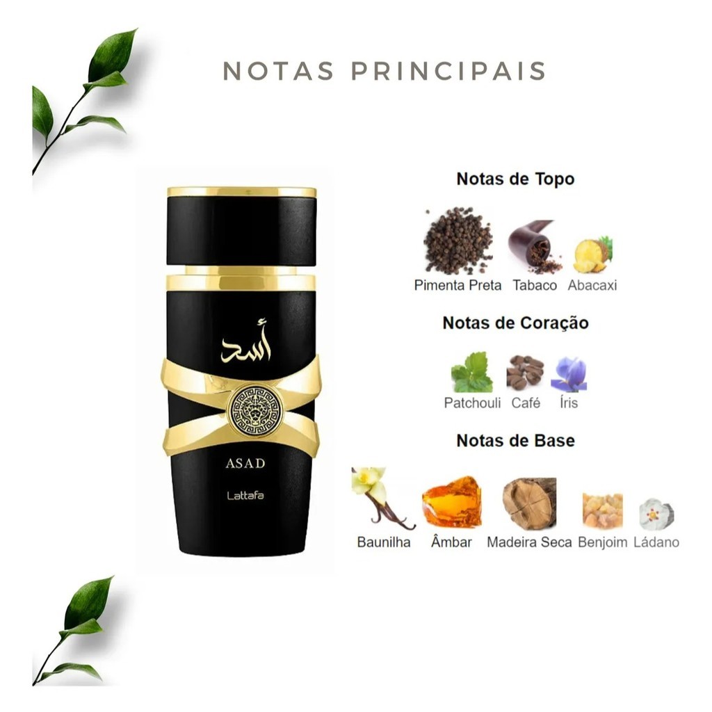 Descubra o Lattafa Asad, uma fragrância masculina que define presença e poder. Em sua concentração Eau de Parfum (EDP), este perfume de 100ml não apenas oferece um aroma distinto, mas também garante uma alta performance em fixação e projeção, perfeito para o homem que exige excelência em seu estilo. 🌟 O Perfil Olfativo Esta composição oriental amadeirada é construída com notas ricas e envolventes, garantindo uma jornada olfativa inesquecível: Saída (Início): Uma abertura energizante e picante, marcada pela intensidade da Pimenta Preta. Coração (Corpo): A alma da fragrância, adicionando profundidade e caráter com notas de Patchouli. Fundo (Base): O toque de luxo e durabilidade é conferido por uma rica fusão de Baunilha, Âmbar, Benjoim e Ládano, deixando um rastro amadeirado e quente. ✅ Diferenciais e Garantia Autenticidade Certificada: Produto Original e acompanhado do Selo 4D exclusivo do Fabricante Lattafa. Desempenho Superior: Sua fórmula EDP oferece uma fixação prolongada que pode durar na pele por até 8 horas. Compromisso Ético: Uma escolha Vegana e Livre de Crueldade (Cruelty Free), respeitando o bem-estar animal. Fabricação de Prestígio: Importado dos Emirados Árabes Unidos, país de origem da renomada casa Lattafa. Uso Versátil: Sua intensidade e elegância o tornam apropriado tanto para ocasiões formais quanto para o uso casual, a qualquer hora do dia ou da noite.