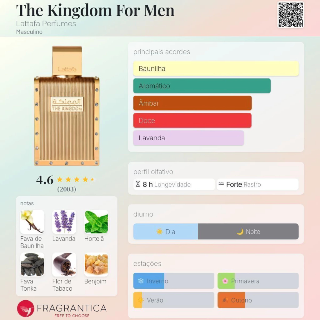 The Kingdom For Men é um perfume masculino da família aromática que traduz elegância moderna, frescor marcante e presença confiante. Sua composição combina notas aromáticas clássicas com acordes adocicados e resinosos, resultando em uma fragrância equilibrada, sofisticada e envolvente. Na versão compacta de 15ml, é ideal para levar na bolsa, nécessaire ou viagens, oferecendo praticidade sem abrir mão da performance olfativa. Notas Olfativas Topo: Lavanda, Hortelã, Sálvia Coração: Baunilha, Tabaco, Flor de Laranjeira Fundo: Fava Tonka, Benjoim, Ládano O Que Você Vai Sentir A abertura traz frescor aromático limpo e revigorante. No coração, a baunilha se mistura ao tabaco e à flor de laranjeira, criando um contraste elegante entre doçura e profundidade. No fundo, a fava tonka, o benjoim e o ládano entregam um rastro quente, sofisticado e masculino na pele. A Essência The Kingdom For Men representa o homem confiante, elegante e de personalidade marcante. Uma fragrância aromática moderna, ideal para quem busca presença e sofisticação sem exageros. Destaques Perfume masculino aromático Perfil fresco, elegante e envolvente Boa projeção e presença Fixação média aproximada de 6 a 8 horas, podendo variar conforme tipo de pele e nível de hidratação Frasco compacto de 15ml, ideal para levar na bolsa