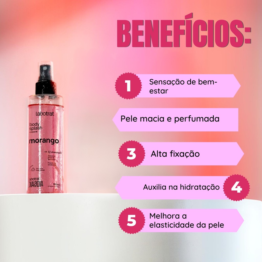Oii, é um prazer ter você aqui! Você já desejou ter um aroma marcante, mas delicado ao mesmo tempo? Seja para se sentir especial ou elevar seu humor, o Perfume Body Splash Labotrat é a escolha perfeita para quem deseja se sentir revigorada e perfumada ao longo do dia. Atenção: Antes de finalizar a sua compra, verifique qual foi o aroma escolhido, para que assim, evite transtornos futuros. O que ele é: - 1 Body Splash com 190ml; - Marca: Labotrat; - Linha: Dia a Dia; - Livre de Parabenos; - Não testado em animais. O que ele tem: - Vitamina E; - Aroma marcante; - Alta fixação; O que ele faz: - Sensação de bem-estar; - Proporciona pele macia e perfumada; - Alta fixação; - Auxilia na hidratação; - Melhora a elasticidade da pele; - Fortalece a barreira cutânea; Onde usar: - Pescoço. - Punhos. - Dobras dos cotovelos. - Atrás das orelhas. Como usar: - Aplicação: Borrife o perfume body splash em áreas como o pescoço, pulsos ou até mesmo sobre a roupa para um aroma sutil e duradouro. Observação: Evitar contato com olhos e mucosas. Caso isso ocorra, enxaguar abundantemente com água. Não utilizar sobre a pele irritada ou lesionada. Em caso de irritação, suspender o uso e procurar orientação médica. Por conter ingredientes de origem natural, poderá ocorrer variações na cor do produto, sem que haja alterações de suas propriedades. Conservar em local fresco, ao abrigo da luz e calor excessivo. Não ingerir. Experimente agora o Perfume Body Splash Labotrat e sinta a diferença na sua rotina. Transforme seu dia com um simples spray! Surgiu alguma dúvida? Entre em contato com a gente! Boas Compras :)