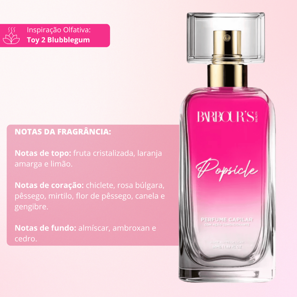 SOBRE O PRODUTO: O Perfume de Cabelo Popsicle é um tratamento bifásico inovador que combina fragrância irresistível com cuidado avançado. Com silicones especiais, oferece proteção térmica, combate o odor e promove brilho, deixando os cabelos envoltos em uma aura vibrante e refrescante. INDICAÇÃO: Perfeito para todos os tipos de cabelo, ideal para quem deseja fios perfumados, protegidos e radiantes em qualquer ocasião. A CIÊNCIA POR TRÁS DA BELEZA: Bifásico com silicones especiais: confere proteção térmica, brilho e combate ao frizz. Fragrância vibrante e deliciosa, inspirada em momentos doces e refrescantes. BENEFÍCIOS: Proteção térmica e antiodor. Fragrância duradoura e envolvente. Realça o brilho natural dos fios. Combate o frizz e mantém os cabelos leves e perfumados MODO DE USO: Agite bem antes de usar para misturar as fases. Borrife nos cabelos secos ou úmidos, a uma distância de 20 cm, concentrando-se nos comprimentos e pontas. Não enxágue. RESULTADOS: Cabelos delicadamente perfumados com uma fragrância sofisticada e elegante, além de protegidos contra o calor e com controle de odores. NOTAS DA FRAGRÂNCIA: Notas de topo: fruta cristalizada, laranja amarga e limão. Notas de coração: chiclete, rosa búlgara, pêssego, mirtilo, flor de pêssego, canela e gengibre. Notas de fundo: almíscar, ambroxan e cedro. Inspirado em: Toy 2 Blubblegum COMPOSIÇÃO: Decametilciclopentasiloxano, Álcool Etílico, Água, Palmitato de Isopropila, Perfume, Propileno Glicol, Glicerol, Fenoxietanol, Etilhexilglicerina, Pidolato de Sódio, Oxibenzona, Corante Azul Brilhante 42090, Corante Vermelho 33, Corante Amarelo de Tartrazina 19140, Corante Vermelho de Ponceau 16255, Corante Preto 28440, Ácido Cítrico, Hidróxido de Sódio, Álcool Benzílico, Salicilato de Benzila, Cumarina, Geraniol, Hidroxicitronelal, Limoneno, Linalol. **Nota de Esclarecimento sobre Referências Olfativas - Barbour's Beauty Na Barbour's Beauty, desenvolvemos produtos com inspirações olfativas únicas, criados para proporcionar experiências sensoriais distintas e enriquecedoras aos nossos clientes. É importante ressaltar que qualquer menção a outras marcas ou produtos em nossas comunicações visa exclusivamente oferecer uma referência olfativa que facilite a identificação das características aromáticas de nossos produtos. Esclarecimentos Importantes: Independência da Marca: A Barbour's Beauty não possui vínculos com quaisquer outras marcas ou produtos mencionados. As referências são utilizadas estritamente para fins de contextualização olfativa. Propriedade das Marcas: Todas as marcas ou produtos mencionados pertencem a seus respectivos fabricantes e desenvolvedores. Uso de Referências: O uso de descrições olfativas similares é uma ferramenta para enriquecer a experiência do consumidor, oferecendo uma noção preliminar dos aromas, sem sugerir similitude completa com produtos de outras marcas. Inspiração Criativa: A menção de ""inspiração olfativa"" não constitui promessa de resultados idênticos ou similares aos de outros produtos no mercado. Cada composição olfativa da Barbour's Beauty é uma criação exclusiva, com direção artística própria. Compromisso com a Qualidade e Transparência: Na Barbour's Beauty, estamos comprometidos em oferecer produtos de alta qualidade, com fragrâncias exclusivas que verdadeiramente capturam a essência de nossa marca. Nosso objetivo é sempre assegurar transparência e clareza para nossos clientes, garantindo uma experiência de compra autêntica e satisfatória.