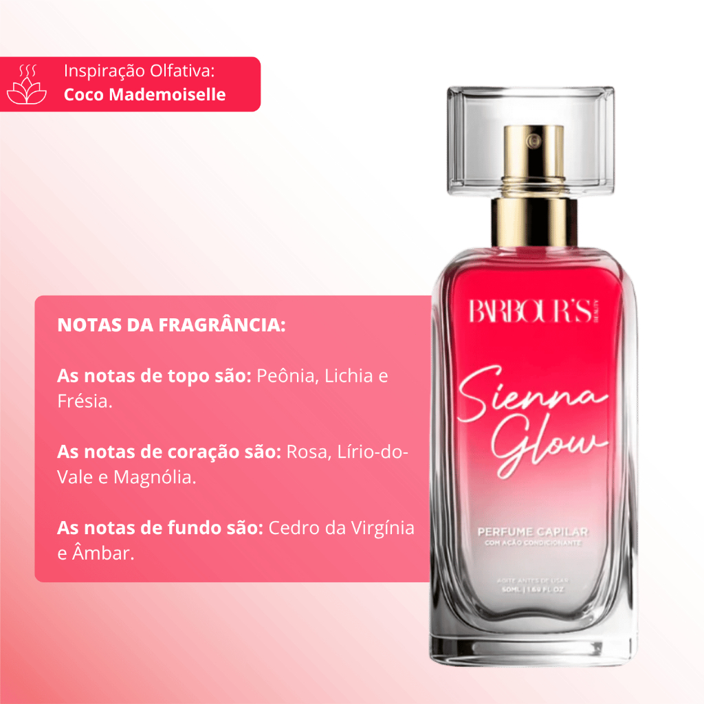 SOBRE O PRODUTO: O Perfume de Cabelo Sienna Glow da Barbour’s Beauty é a escolha ideal para quem busca sofisticação e frescor nos cabelos. Com uma fragrância irresistível de peônia, líchia, rosa e âmbar, ele envolve os fios em um perfume duradouro, mantendo-os sempre radiantes e com um toque extra de brilho. Sua fórmula possui silicones especiais que conferem proteção térmica. INDICAÇÃO: Indicado para todos os tipos de cabelo, especialmente para quem deseja fios perfumados e com brilho natural, protegidos dos odores externos. A CIÊNCIA POR TRÁS DA BELEZA: Fixação Duradoura: Fórmula desenvolvida para fixação prolongada nos fios, garantindo frescor por mais tempo. Brilho Natural: Ingredientes que intensificam o brilho sem agredir ou ressecar os cabelos. BENEFÍCIOS: Fragrância sofisticada que combina com qualquer ocasião. Fórmula leve que não pesa nos fios, ideal para uso diário. Protege o cabelo de odores externos, como fumaça e poluição, mantendo os fios frescos e perfumados. MODO DE USO: Agite bem o frasco e borrife o perfume capilar nos cabelos secos ou úmidos, mantendo uma distância de 15 cm. Aplique uniformemente por todo o comprimento dos fios, focando nas pontas. Reaplique ao longo do dia conforme necessário. Não é necessário enxaguar. RESULTADOS: Cabelos delicadamente perfumados, com frescor e fragrância duradoura. Brilho intenso e proteção contra odores externos. Fios mais macios e com aspecto saudável. NOTAS DA FRAGRÂNCIA: As notas de topo são: Peônia, Lichia e Frésia. As notas de coração são: Rosa, Lírio-do-Vale e Magnólia. As notas de fundo são: Cedro da Virgínia e Âmbar. Inspirado em: Coco Mademoiselle** COMPOSIÇÃO: Decametilciclopentasiloxano, Álcool Etílico, Água, Palmitato de Isopropila, Perfume, Propileno Glicol, Glicerol, Fenoxietanol, Etilhexilglicerina, Pidolato de Sódio, Oxibenzona, Corante Azul Brilhante 42090, Corante Vermelho 33, Corante Amarelo de Tartrazina 19140, Corante Vermelho de Ponceau 16255, Corante Preto 28440, Ácido Cítrico, Hidróxido de Sódio, Álcool Benzílico, Salicilato de Benzila, Cumarina, Geraniol, Hidroxicitronelal, Limoneno, Linalol. **Nota de Esclarecimento sobre Referências Olfativas - Barbour's Beauty Na Barbour's Beauty, desenvolvemos produtos com inspirações olfativas únicas, criados para proporcionar experiências sensoriais distintas e enriquecedoras aos nossos clientes. É importante ressaltar que qualquer menção a outras marcas ou produtos em nossas comunicações visa exclusivamente oferecer uma referência olfativa que facilite a identificação das características aromáticas de nossos produtos. Esclarecimentos Importantes: Independência da Marca: A Barbour's Beauty não possui vínculos com quaisquer outras marcas ou produtos mencionados. As referências são utilizadas estritamente para fins de contextualização olfativa. Propriedade das Marcas: Todas as marcas ou produtos mencionados pertencem a seus respectivos fabricantes e desenvolvedores. Uso de Referências: O uso de descrições olfativas similares é uma ferramenta para enriquecer a experiência do consumidor, oferecendo uma noção preliminar dos aromas, sem sugerir similitude completa com produtos de outras marcas. Inspiração Criativa: A menção de ""inspiração olfativa"" não constitui promessa de resultados idênticos ou similares aos de outros produtos no mercado. Cada composição olfativa da Barbour's Beauty é uma criação exclusiva, com direção artística própria. Compromisso com a Qualidade e Transparência: Na Barbour's Beauty, estamos comprometidos em oferecer produtos de alta qualidade, com fragrâncias exclusivas que verdadeiramente capturam a essência de nossa marca. Nosso objetivo é sempre assegurar transparência e clareza para nossos clientes, garantindo uma experiência de compra autêntica e satisfatória.