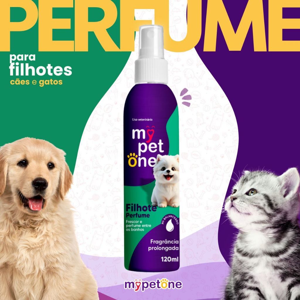 Perfume Filhote My Pet One – 120mL Delicadeza, carinho e frescor para os primeiros cuidados do seu pet. O Perfume Filhote My Pet One foi desenvolvido especialmente para filhotes de todas as raças, com uma fragrância suave que não agride o olfato sensível dos pequenos. Ideal para uso após o banho ou entre higienizações, ele proporciona um cheirinho agradável e duradouro, com fórmula segura para a pele delicada dos filhotes. Benefícios: - Fragrância leve, delicada e segura para filhotes; - Ideal para cães de todas as raças; - Fórmula suave, não irritante e de uso diário; - Prolonga a sensação de banho tomado; Modo de Uso: Borrife o produto a uma distância de aproximadamente 15cm da pelagem do pet, evitando a região dos olhos, focinho, boca e genitais. Pode ser usado após o banho ou sempre que desejar renovar o perfume do filhote. Especificações Técnicas: - Apresentação: Perfume em spray - Volume: 120mL - Indicação: Filhotes de cães de todas as raças - Idade: A partir de 90 dias My Pet One – Cuidar é demonstrar amor todos os dias.