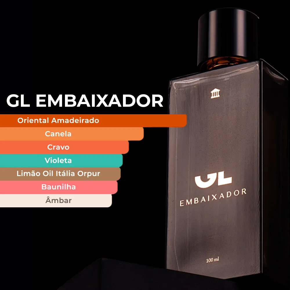 Descrição Perfume Gusttavo Lima Embaixador de Alta Fixação A essência do embaixador é o encontro de ingredientes raros e potentes, é sedução pura. Um perfume extremamente quente e envolvente, Notas de madeiras marcantes abraçam o calor envolvente do âmbar e reforçam a assinatura sedutora. Perfeito para um homem maduro, empoderado e que não abre mão da elegância e sofisticação. Surpreende logo de cara com notas cítricas e frescas, combinadas com a assinatura masculina da canela, lavanda e sálvia. Perfume Masculino Nacional que agrada muito as mulheres com facilidade.