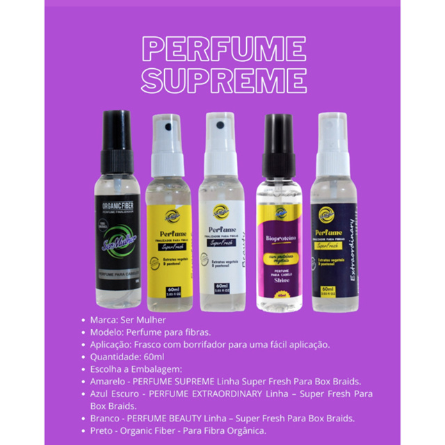 Perfume para Cabelo Ser Mulher. Deixe suas fibras cheirosas com esse maravilhoso Perfume para Cabelo. Sucesso de vendas, pois além de ter um maravilho cheiro. Os perfumes da Ser Mulher tem em sua fórmula extratos vegetais e D-Pantenol. Modo de usar: Borrife o perfume finalizador nas fibras secas. Marca: Ser Mulher Modelo: Perfume para fibras. Aplicação: Frasco com borrifador para uma fácil aplicação. Quantidade: 60ml Escolha a Embalagem: Amarelo - PERFUME SUPREME Linha Super Fresh Para Box Braids. Azul Escuro - PERFUME EXTRAORDINARY Linha – Super Fresh Para Box Braids. Branco - PERFUME BEAUTY Linha – Super Fresh Para Box Braids. Preto - Organic Fiber - Para Fibra Orgânica. Perfume Ser Mulher Shine para Bio fibra e cabelo orgânico. Contém 60 ml. Contém bioproteina que protege a fibra por mais tempo. Mantém suas fibras cheirosas Prático de usar sua aplicação é por spray. Recomendação: borrifar nas fibras quando secas.