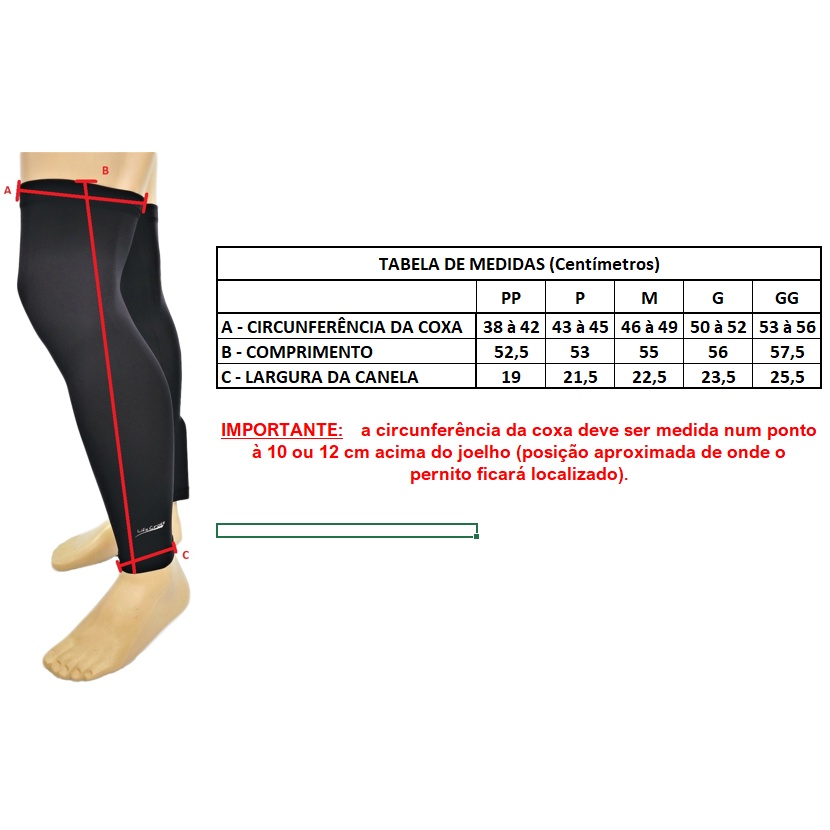Pernito para proteção das pernas, excelente para atividades ao ar livre. Produto de excelente qualidade e acabamento, produzido em tecido de poliamida e elastano com tecnologia DRY que absorve e elimina o suor, fornecendo também proteção UV 50+. Possui elástico com aplicação de silicone para evitar que deslize. Produto super confortável. Refrigeração corporal quando em contato com a pele. Ideal para motoqueiros, ciclistas e esportistas em geral. Composição: 92% Poliamida e 8% Elastano Tamanhos: PP, P, M, G e GG Cor: Preto Medidas (circunferência da coxa x comprimento): Tamanho P: 32 x 49,5 cm Tamanho M: 33 x 51,5 cm Tamanho G: 35 X 52,0 cm Tamanho GG: 36,5 X 52,5 cm Obs.: Medidas aproximadas, podem haver pequenas variações.