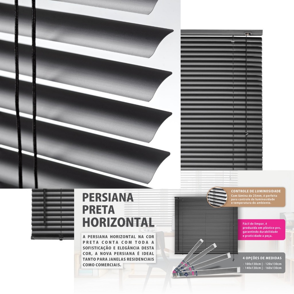 DESCRIÇÃO DO PRODUTO: Persiana horizontal de plástico PVC. Lâmina de 25mm. Fácil de limpar e está disponível em diversos tamanhos e em três cores. Durabilidade, praticidade e elegância. Ideal para janelas residenciais e comerciais. Controle de luminosidade e temperatura do ambiente. INDICAÇÃO DE USO: Ideal para janelas residenciais e comerciais. Controle de luminosidade e temperatura do ambiente. Marca: Atlas Cor Branco / Cinza / Preto Linha: Primafer Controle de luminosidade Lâminas de PVC 25mm Largura: 100cm Altura: 130cm Acompanha itens para instalação A limpeza da persiana é muito simples. Use um pano úmido ou espanador -Produtos 100% originais -Produto com garantia -Envio imediato -Produto 100% em estoque -Nota fiscal para 100% das vendas -Suporte ao cliente -Embalagens seguras Qualquer duvida estamos a disposição Obrigado