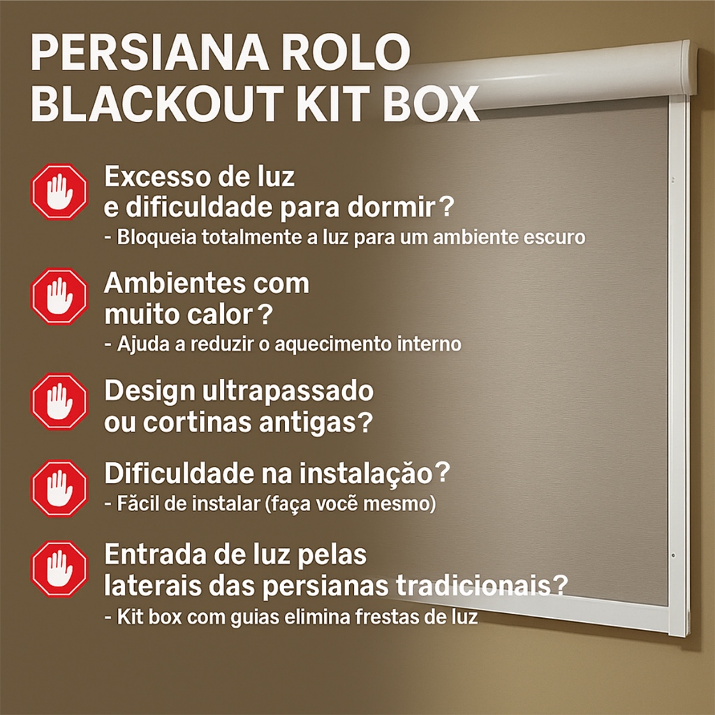 Persiana Rolô Blackout Kit Box Para Janelas de 1,20x1,20m Transforme seu ambiente com a Cortina Rolô Blackout Caixa Box! Ideal para janelas de 1,20m de largura e 1,20m de altura, este produto é a solução perfeita para quem busca conforto e estilo. Utilizado em sala, quarto e escritório. Características do Produto: - **Vedação Eficiente**: Com perfis laterais e inferior de alumínio, a persiana garante a vedação total, evitando a entrada de luz e proporcionando um ambiente mais escuro. - **Cores Disponíveis**: Escolha entre as cores branco ou preto para o bandô e guias em alumínio, combinando perfeitamente com sua decoração. - **Dimensões**: Largura da persiana: 1,31m / Altura da persiana: 1,34m. - **Instalação Simples**: A instalação é feita por fora da janela com fixação na parede. O manual inclusa facilita ainda mais o processo. - **Tecido Liso 100% Blackout**: Composto por 100% poliéster, disponível nas cores Branco, Creme, Bege, Cinza e Preto, o tecido oferece máxima eficiência no bloqueio da luz. - **Fácil Limpeza**: Mantenha sua persiana sempre linda! Pode ser limpa facilmente com um espanador ou aspirador de pó com bocal de escova. - **Durabilidade e Resistência**: Produto PREMIUM que garante longa durabilidade. - **Kit Completo**: Acompanha persiana, buchas e parafusos, tudo que você precisa para uma instalação perfeita. Escolha o Lado do Comando: - Você pode optar pelo lado do comando: Direito ou Esquerdo, de acordo com sua preferência. Importante Saber: - A janela não pode ter puxadores ou marco de alumínio/madeira que ultrapasse 5mm para frente da parede. Isso evitará que o perfil inferior bata no puxador ou fique raspando no marco, impossibilitando a descida do tecido. - Para janelas que não possuem veneziana (somente vidro), o bloqueio de luz pode não chegar a 100%, ficando em torno de 95%. Adquira já a sua Persiana Rolô Blackout Caixa Box e transforme seu espaço com praticidade e estilo! (249719)
