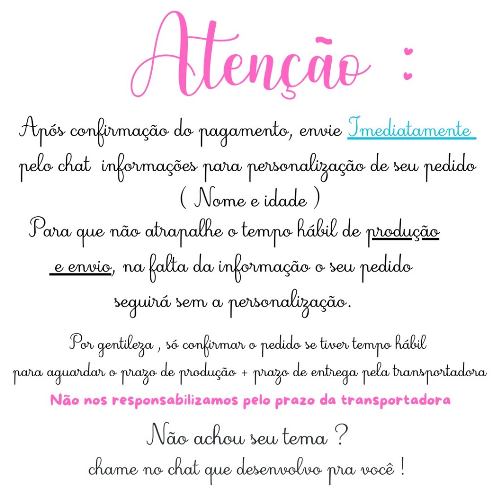 LEIA ATENTAMENTE ANTES DE CONFIRMAR SUA COMPRA ! Este anúncio se trata de kit PEGUE MONTE ( caixas desmontadas ) Vão vincadas e recordadas para que o cliente finalize a colagem em casa recomendamos usar colar branca de boa qualidade Quantidades de cada Kit disponível: 20 peças: 4 unidades de cada modelo. 30 peças: 6 unidades de cada modelo. 40 peças: 8 unidades de cada modelo. 50 peças: 10 unidades de cada modelo. * Não modificamos as quantidades de modelos dos kits* MEDIDAS DAS CAIXINHAS : Caixa Milk - 15 cm (Altura) x 6 cm (Comprimento) x 6 cm (Largura) (ÁREA ÚTIL 9 cm x 6,5 cm x 6,5 cm) Caixa Pirâmide - 19,5 cm (Altura) x 7,5 cm (Largura) x 7,5 cm (Profundidade) Caixa Maleta laço - 11 cm (Altura) x 9,5 cm (Largura) x 4,5 cm (Profundidade) (ÁREA ÚTIL 7 cm x 9 cm x 4,5 cm) Caixa Maleta coração - 10 cm (Altura) x 9 cm (Largura) x 4,5 cm (Profundidade) (ÁREA ÚTIL 7 cm x 9 cm x 4 cm) Caixa Coração 14 ( Altura) x5 Largura x 11 cm (Profundidade) ANTES DE FECHAR O PEDIDO Confirme se consegue aguardar pelo prazo de produção + prazo de entrega , só confirme o pedido caso tenha certeza que tem tempo hábil para aguardar . Por se tratar de produtos personalizados , precisamos do prazo para produção . *Após o pagamento enviar IMEDIATAMENTE o nome e idade da criança em até 10 horas , na falta dessa informação no prazo , estaremos enviando sem a personalização, para que não comprometa o prazo de envio* Produzidos em papel FOSCO ( Não fotográfico ) 180g , o mais usado e recomendado entre as papelarias por se tratar de um material que NÃO DESBOTA com tempo e exposição de luz . Temos opção COM LAÇO E SEM LAÇO. KITS COM LAÇOS: Fita de cetim número 09 produzidos em máquina profissional de alta qualidade e acabamento com pérola de 8 mm A cor do laço pode variar de acordo estoque ou disponibilidade do fabricante das fitas As caixinhas são enviadas cortadas e vincadas, para você colar e montar e enviamos desta forma para não amassar e otimizar para o cliente o valor do frete. (SÃO SIMPLES DE MONTAR E ENVIAMOS UM VÍDEO REFERÊNTE A MONTAGEM ) * As cores dos produtos podem variar de tonalidade e cor de acordo com a configuração de cada monitor, tela de celular e claridade do local onde a foto foi tirada * _ OBSERVAÇÕES IMPORTANTES__ * NÃO ACOMPANHA APLIQUES ( SOMENTE NO TOPO DA CX PIRÂMIDE ) NÃO TRABALHAMOS COM TAG, NÃO EXISTE POSSIBILIDADE DE ACRESCENTAR. *NÃO ENVIAMOS COLADOS, VÃO CORTADOS E VINCADOS *NÃO ALTERAMOS A ARTE, VAI EXATAMENTE COMO NO ANÚNCIO, ADICIONAMOS O NOME E IDADE DA SUA CRIANÇA * PARA ARTE NOVAS , solicite através do chat o anúncio para pedidos personalizamos! CASO NÃO ACHE O TEMA QUE DESEJA , NOS DESENVOLVEMOS PRA VOCÊ