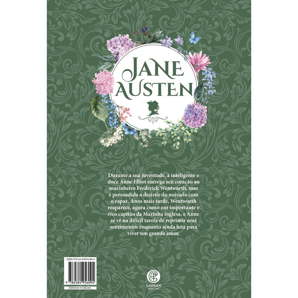 Durante a sua juventude, a inteligente e doce Anne Elliot entrega seu coração ao marinheiro Frederick Wentworth, mas é persuadida a desistir do noivado como rapaz. Anos mais tarde, Wentworthr e aparece, agora como um importante e rico capitão da Marinha inglesa, e Anne se vê na difícil tarefa de reprimir seus sentimentos enquanto ainda luta para viver um grande amor. SOBRE O AUTOR Jane Austen, uma da smaiores romancistas da literatura inglesa, nasceu na vila de Steventon(Hampshire), em 16 de dezembro de 1775 e cresceu em uma família unida e feliz. Seus pais, Cassandra e George Austen, eram membros respeitados na comunidade local, sendo que criaram seus oito filhos (seis meninos e duas meninas) em um ambiente propício ao aprendizado e à criatividade. Sabe-se que as crianças eram estimuladas a ler os diversos títulos dispostos na extensa biblioteca de seu pai. Não por acaso a autora descobriu seu talento ainda jovem. Fascinada pelo universo das histórias, começou a escrever seus próprios romances, poemas e peças ainda na adolescência, em1790. Tinha apenas 21 anos quando escreveu Orgulho e Preconceito, em 1797, mas a obra só chegou a ser publicada em 1813 por contada grande aceitação de seu primeiro título: Razão e Sensibilidade. Seus romances, caracterizados pela narrativa elegante, pelo cuidados o retrato dos costumes de sua época e pela abordagem singular da busca pelo amor e pela felicidade, continuam ocupando lugar de destaque entre os clássicos atemporais, mesmo mais de dois séculos após sua morte, em 18 de julho de 1817. DESCRIÇÃO DO PRODUTO ISBN13: 9786584956100 Páginas: 160 Publicação: 2ª Edição - 2022 | Editora Garnier Encadernação: Capa Dura Formato: 15,1 x 23,0 cm Autor: Jane Austen