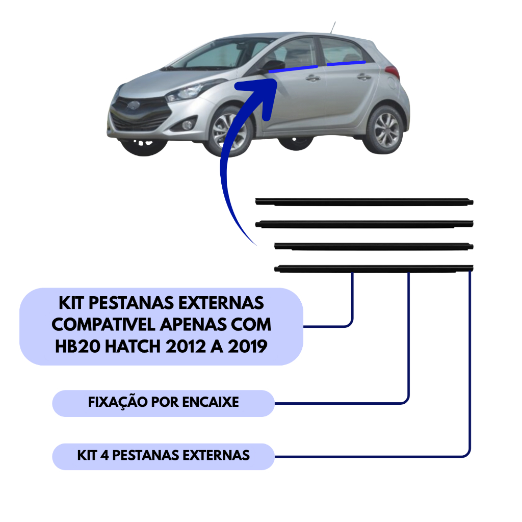 Kit Pestana Externa Dianteira e Traseira Hb20 Hatch 2012 a 2019 **Aplicação: - HB20 Hatch 2012 a 2019 - NÃO SERVE NO MODELO NOVO **COMPOSIÇÃO DOS KITS DE PESTANA EXTERNAS - KIT DIANTEIRA - 01 pestana dianteira lado direito + 01 pestana dianteira lado esquerdo - KIT TRASEIRA - 01 pestana traseira lado direito + 01 pestana traseira lado esquerdo - KIT DIANTEIRA + TRASEIRA - 01 pestana dianteira lado direito + 01 pestana dianteira lado esquerdo + 01 pestana traseira lado direito + 01 pestana traseira lado esquerdo * modelo aplicação por encaixe - Ultra Resistente e de excelente qualidade. Produto não é original da montadora, apenas similar ao original de fabricação nacional - Produto Novo de 1º linha - Recomendamos que a instalação seja feita sempre por um profissional, não nos responsabilizamos por má instalação. Garantia: 30 Dias da emissão da NF Dúvidas? Manda no chat, estamos disponíveis para lhe atender