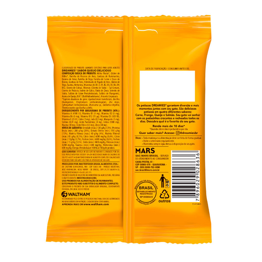Petisco Dreamies para Gatos Adultos – Queijo 40g - Indicado para gatos; - Ideal para gatos adultos; - Petisco rico em nutrientes; - Crocante por fora macio por dentro; - Rende mais de 20 dias, dando 3 pedacinhos por dia; - Irresistível sabor de queijo. O Petisco Dreamies garantem diversão e mais momentos junto com seu gato. Os gatos simplesmente não conseguem resistir ao excelente sabor das guloseimas DREAMIES. O seu gatinho vai sonhar com os pedacinhos crocantes e recheados todos os dias. Descubra qual é o favorito do seu gato! Petiscos para gatos podem fazer parte da dieta dos felinos, desde que não sejam oferecidos de forma exagerada. Com sabor atraente e delicioso, os gatos vão a loucura quando veem os petiscos por perto. Dreamies Queijo vai deixar o seu gato muito feliz. Indicado para gatos adultos, ele é uma ótima ferramenta para reforçar positivamente o comportamento do felino e assim educá-lo. Ingredientes Milho Moído, Glúten de Milho, Farinha de Vísceras de Aves, Gordura de Ruminantes, Quirera de Arroz, Farinha de Trigo, Farinha de Carne e Ossos de Bovino, Gordura de Aves, Hidrolisado de Fígado de Aves, Glúten de Trigo, Taurina, Metionina, Vitaminas (A, D3, E, B1, B2, B3, B5, B6, B9, B12, Cloreto de Colina), Minerais (Cloreto de Sódio - Sal Comum, Cloreto de Potássio, lodeto de Cálcio, Óxido de Zinco, Selenito de Sódio, Sulfato de Cobre Pentahidratado, Sulfato de Manganês), Aroma de Queijo, B.H.T. (Butilhidroxitolueno), Amarelo Crepúsculo.