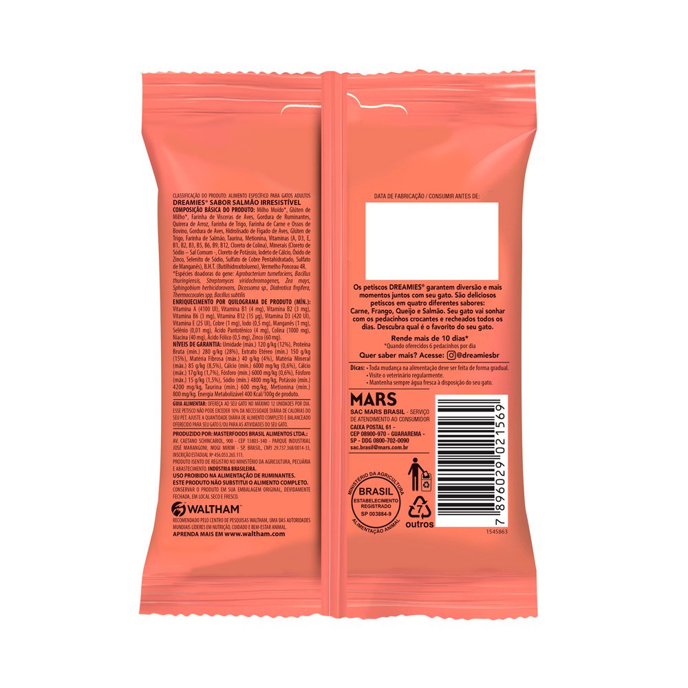 - Indicado para gatos;- Ideal para gatos adultos;- Petisco rico em nutrientes;- Crocante por fora macio por dentro;- Rende mais de 20 dias, dando 3 pedacinhos por dia;- Irresistível sabor de salmão. O Petisco Dreamies garantem diversão e mais momentos junto com seu gato. Os gatos simplesmente não conseguem resistir ao excelente sabor das guloseimas DREAMIES. O seu gatinho vai sonhar com os pedacinhos crocantes e recheados todos os dias. Descubra qual é o favorito do seu gato! Petiscos para gatos podem fazer parte da dieta dos felinos, desde que não sejam oferecidos de forma exagerada. Com sabor atraente e delicioso, os gatos vão a loucura quando veem os petiscos por perto. Dreamies Salmão vai deixar o seu gato muito feliz. Indicado para gatos adultos, ele é uma ótima ferramenta para reforçar positivamente o comportamento do felino e assim educá-lo. IngredientesMilho Moído, Glúten de Milho, Farinha de Vísceras de Aves, Gordura de Ruminantes, Quirera de Arroz, Farinha de Trigo, Farinha de Carne e Ossos de Bovino, Gordura de Aves, Hidrolisado de Fígado de Aves, Glúten de Trigo, Farinha de Salmão, Taurina, Metionina, Vitaminas (A, D3, E, B1, B2, B3, B5, B6, B9, B12, Cloreto de Colina), Minerais (Cloreto de Sódio – Sal Comum -, Cloreto de Potássio, Iodeto de Cálcio, Óxido de Zinco, Selenito de Sódio, Sulfato de Cobre Pentahidratado, Sulfato de Manganês), B.H.T. (Butilhidroxitolueno), Vermelho Ponceau 4R.