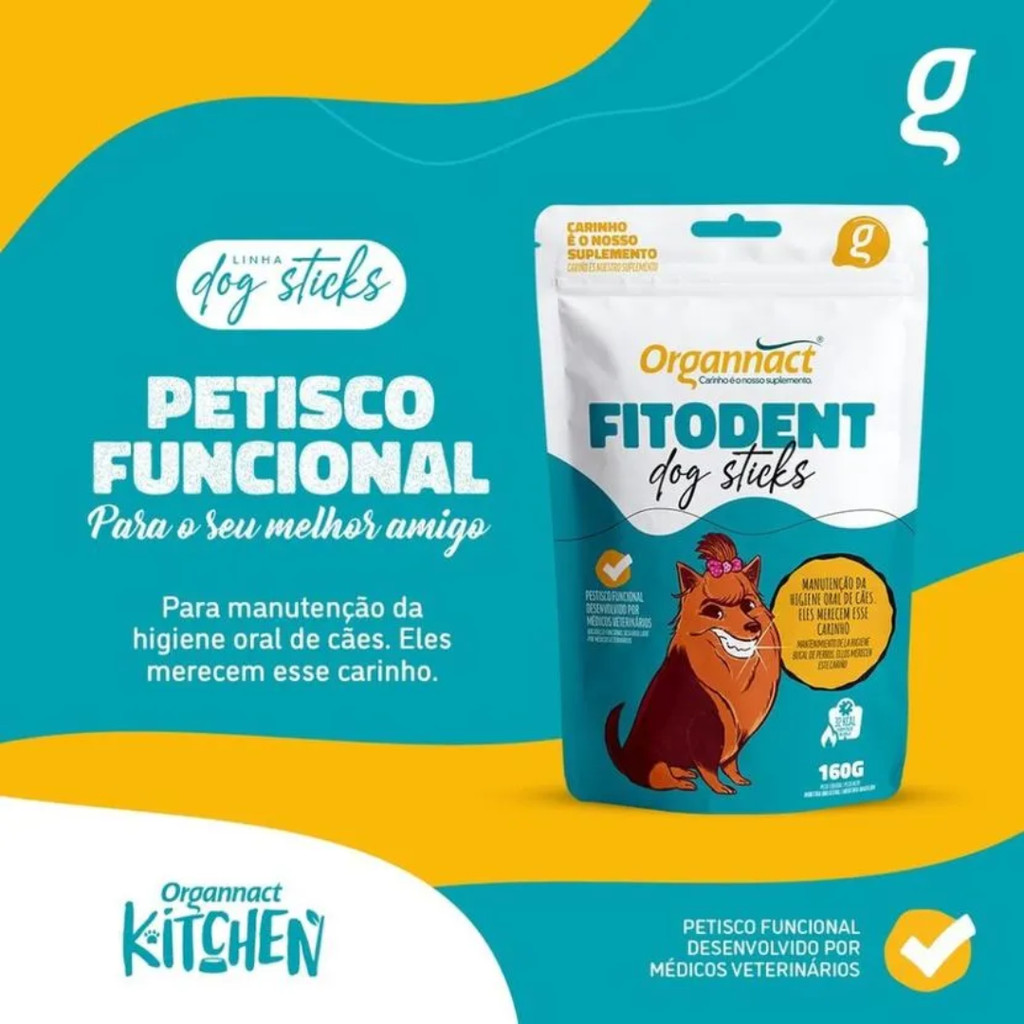 *PRODUTO ORIGINAL COM NOTA FISCAL ENVIADA POR E-MAIL E ANEXADA AO PACOTE! **Só trabalhamos com produtos de data de validade superior a NO MÍNIMO 90 dias. O Fitodent Dog Sticks, da Organnact, é um suplemento alimentar mastigável desenvolvido especialmente para auxiliar na higiene bucal dos cães. Com ingredientes funcionais, como extrato de própolis, clorofila e extrato de chá verde, os sticks ajudam a reduzir o mau hálito, a formação de placa bacteriana e de tártaro, promovendo uma saúde oral mais completa. Além de contribuir para a limpeza dos dentes por meio da mastigação, os sticks têm sabor atrativo e são facilmente aceitos pela maioria dos cães. Seu formato e textura favorecem o atrito com os dentes, potencializando o efeito mecânico de remoção de resíduos. Indicação: Indicado para cães adultos e filhotes a partir de 3 meses de idade, de todas as raças e portes. Composição básica: Extrato de própolis Extrato de chá verde Clorofila Glicerina, gelatina, colágeno, entre outros ingredientes naturais Principais benefícios: Auxilia na redução da halitose (mau hálito) Contribui para a prevenção da placa bacteriana e do tártaro Promove saúde bucal por meio da mastigação Fórmula com ingredientes naturais e funcionais Textura que favorece a ação mecânica nos dentes Modo de uso: Fornecer diretamente ao cão, respeitando as recomendações de quantidade conforme o porte do animal, ou de acordo com a orientação do médico-veterinário. Apresentação: Embalagem com sticks mastigáveis 160g Recomendações: Uso exclusivo para cães Conservar em local fresco, seco e ao abrigo da luz Produto não substitui a escovação nem a avaliação veterinária