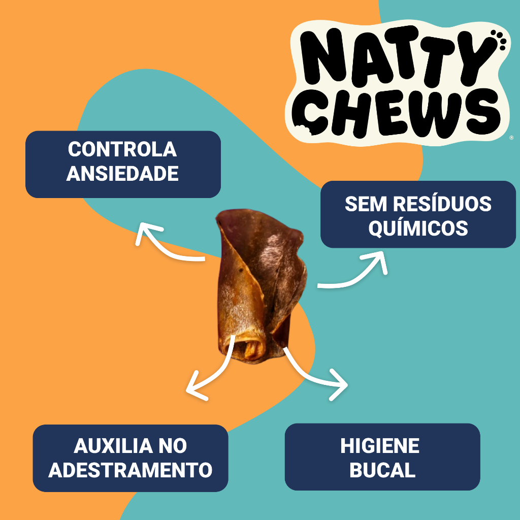 O Petisco Orelhones Natty Chews Orelha Bovina é um mastigável natural e nutritivo, indicado para cães de todos os portes. Produzido a partir de orelhas bovinas selecionadas, oferece longa duração, auxilia na saúde bucal e ajuda a satisfazer o instinto de mastigação dos pets. Além de saudável e saboroso, contribui para reduzir o estresse e manter os dentes mais limpos, promovendo bem-estar no dia a dia. FICHA TÉCNICA Marca: Natty Chews Linha: Orelhones Produto: Orelha bovina mastigável Indicação: Cães de todos os portes Apresentação: Pacote com 3 unidades Benefícios: Auxilia na higiene bucal e reduz o estresse Origem: 100% natural, sem aditivos artificiais CUIDADOS COM O PRODUTO Oferecer sempre sob supervisão Indicado apenas como petisco complementar, não substitui a alimentação Retirar fragmentos pequenos que possam ser ingeridos Armazenar em local fresco, seco e protegido da umidade Manter fora do alcance de crianças e animais não indicados Não oferecer a cães muito pequenos que possam engasgar Sempre disponibilizar água fresca junto ao petisco