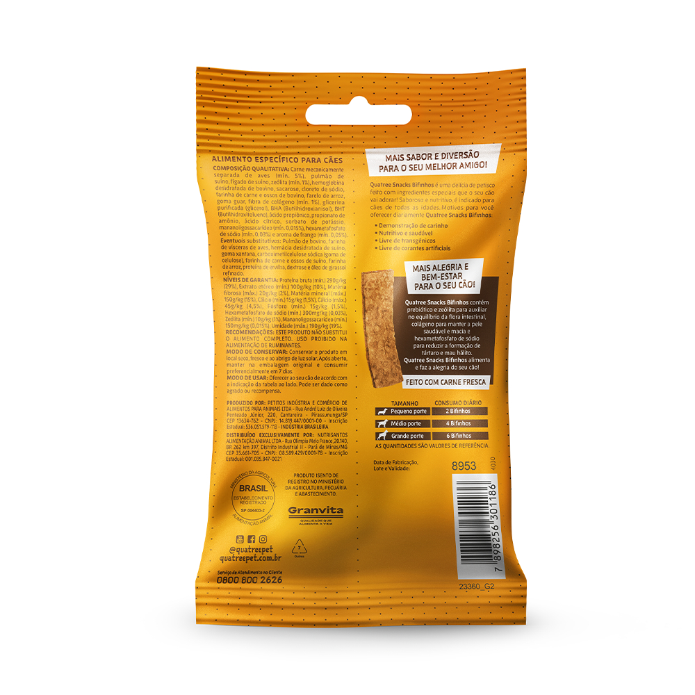 Petisco Quatree Snack Bifinho Cão Frango 500 gr Quatree Snacks Bifinhos é uma delícia de petisco feito com ingredientes especiais que o seu cão vai adorar! Saboroso e nutritivo, é indicado para cães de todas as idades. Quatree Snacks Bifinhos contém prebiótico e zeólita para auxiliar no equilíbrio da flora intestinal, colágeno para manter a pele saudável e macia e hexametafosfato de sódio para reduzir a formação de tártaro e mau hálito. Quatree Snacks Bifinhos alimenta e faz a alegria do seu cão! ________________________________________________________________________________________________________________ COMPOSIÇÃO BÁSICA Carne mecanicamente separada de aves (mín. 5%), pulmão de suíno, fígado de suíno, zeólita (mín. 1%), hemoglobina desidratada de bovino, sacarose, cloreto de sódio, farinha de carne e ossos de bovino, farelo de arroz, goma guar, fibra de colágeno (mín. 1%), glicerina purificada (glicerol), BHA (butilhidroxianisol), BHT (butilhidroxitolueno), ácido propiônico, propionato de amônio, ácido cítrico, sorbato de potássio, mananoligossacarídeo (mín. 0,015%), hexametafosfato de sódio (mín. 0,03%) e aroma de frango (mín. 0,05%). Eventuais substitutivos: Pulmão de bovino, farinha de vísceras de aves, hemácia desidratada de suíno, goma xantana, carboximetilcelulose sódica (goma de celulose), farinha de carne e ossos de suíno, farinha de arroz, proteína de ervilha, dextrose e óleo de girassol refinado. ________________________________________________________________________________________________________________ NÍVEIS DE GARANTIA Proteína bruta (mín.) 290g/kg (29%) Extrato etéreo (mín.) 100g/kg (10%) Matéria fibrosa (máx.) 20g/kg (2%) Matéria mineral (máx.) 150g/kg (15%) Cálcio (mín.) 15g/kg (1,5%) Cálcio (máx.) 45g/kg (4,5%) Fósforo (mín.) 15g/kg (1,5%) Hexametafosfato de sódio (mín.) 300mg/kg (0,03%) Zeólita (mín.) 10g/kg (1%) Mananoligossacarídeo (mín.) 150mg/kg (0,015%) Umidade (máx.) 190g/kg (19%