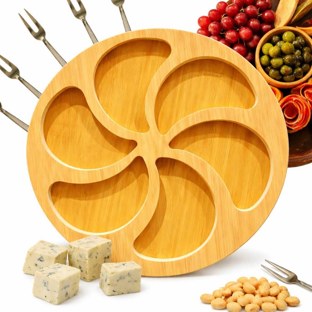 Petisqueira Tábua Redonda + 6 Garfos Inox Para Petiscos Frios, Queijos e Frutas Gamela Bandeja 29CM