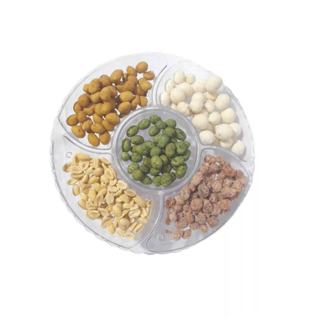 PETISQUEIRA TRANSPARENTE EM ACRÍLICO COM PÉ REMOVÍVEL – 5 DIVISÓRIAS A petisqueira é a peça ideal para servir seus convidados com estilo. Com cinco cavidades é perfeita para apresentar uma variedade de comidas doces e salgadas. Feita em plástico resistente e de fácil limpeza, seu design transparente acrescenta um toque de beleza à mesa. Dimensões do produto: Altura com pé: 8 cm Diâmetro:23,5 cm