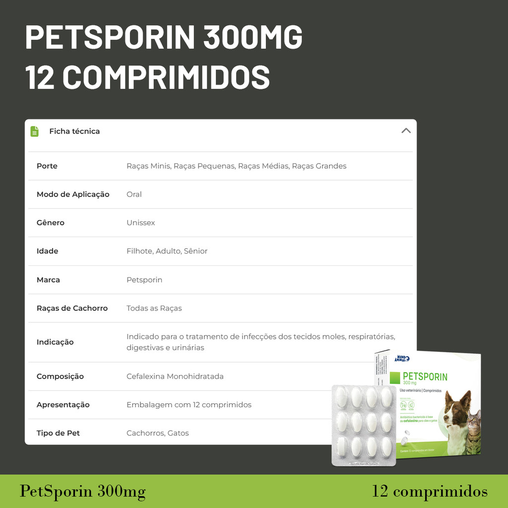 Petsporin 300mg Antibiótico Cães E Gatos Com 12 Comprimidos