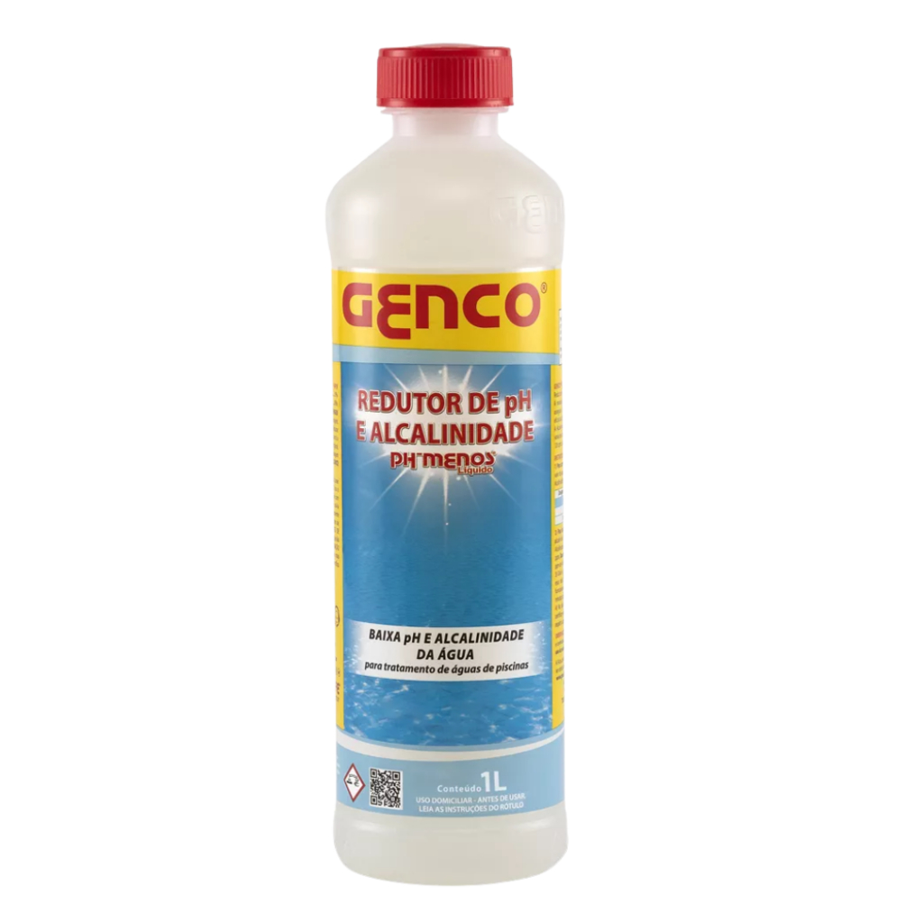 Redutor de pH e Alcalinidade Genco 1 Litro O redutor de pH e alcalinidade Genco é um ácido líquido para baixar o pH e a alcalinidade total. Utilizar quando o pH estiver acima de 7,8 ou a alcalinidade total acima de 120 ppm. Instruções de uso: 1. Mantenha o pH dentro da faixa ideal entre 7,4 e 7,6, a alcalinidade total entre 80 e 120 ppm e a dureza cálcica entre 200 e 400 ppm. 2. Analise diariamente o pH e, se estiver acima de 7,8, corrija-o com o redutor de pH. Já alcalinidade total deve ser analisada semanalmente e corrigida sempre que estiver acima de 120 ppm. OBSERVAÇÃO: As dosagens recomendadas deverão servir apenas de guia inicial e conferidas com testes frequentes após as devidas correções, pois as dosagens podem variar de acordo com alcalinidade total da água. 4. Adicione a dosagem recomendada em um balde plástico com água da própria piscina e espalhe essa solução sobre a superfície da água com o sistema de filtração em funcionamento (válvula do filtro na posição filtrar) e mantenha a filtração por pelo menos 30 a 60 minutos após aplicação do produto. 5. No dia seguinte reanalise o pH e alcalinidade total para certificar-se de que está na faixa ideal recomendada. Em caso negativo, repita a operação. 6. Só utilizar a piscina 30 minutos após aplicação do produto.