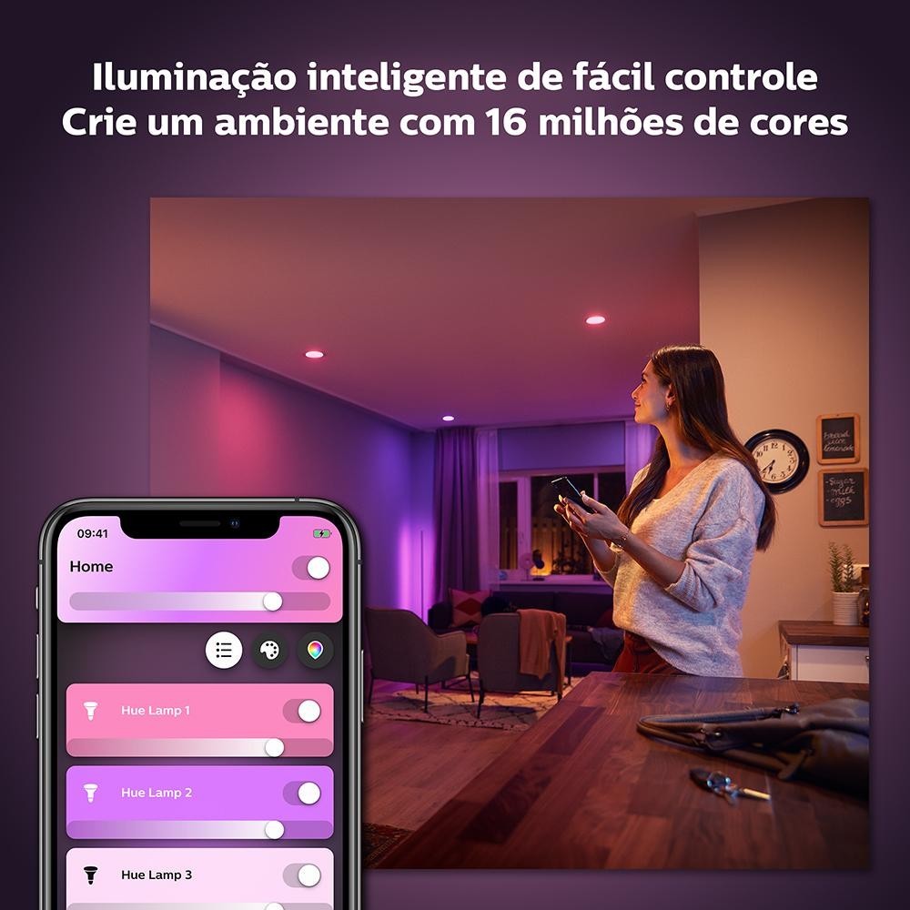 Philips Hue Lâmpada Inteligente 9W 220V WiFi e Bluetooth base E27Iluminação inteligente: simplesmente quer mudar o clima? comece com o controle pelo aplicativo Bluetooth; adicione até 10 lâmpadas inteligentes hue Bluetooth/zigbee com o hue Bluetooth appJá possui uma bridge hue? esta luz inteligente, compatível com Bluetooth, funciona também com o seu hub da hue e pode ser perfeitamente integrada ao seu ecossistema hueAtivação por voz: para a melhor experiência em casa inteligente conecte essas lâmpadas ao seu assistente de voz favorito como alexa, Apple homekit ou google assistant usando o hub da hueo clima certo: estilize a decoração da sua casa com detalhes em cores, transforme sua sala de estar em um cinema ou use cores divertidas para sua próxima festaPotencial da hue: para obter mais recursos da iluminação inteligente, adicione uma bridge hue (vendida separadamente) às suas luzes inteligentes para desbloquear o potencial completo da Philips hueTodos os produtos HUE possuem 2 anos de garantia