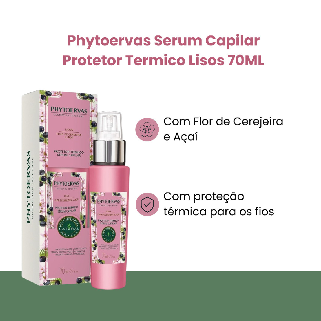 PHYTOERVAS SERUM CAPILAR LISOS 70ML Protetor Térmico Sérum Capilar Lisos Flor de Cerejeira e Açaí Phytoervas 70ml Para cabelos lisos ou alisados, a linha Lisos foi desenvolvida com flor de laranjeira e açaí, importantes ativos naturais que agem na hidratação, no controle dos fios e aumento do brilho. Hidrata, reduz o volume e melhora a textura. ATRIBUTOS: A linha Lisos foi desenvolvida com flor de cerejeira e açaí, importantes ativos naturais que agem na hidratação, no controle dos fios e aumento do brilho. INDICAÇÃO: cabelos lisos ou alisados BENEFÍCIOS: Reduz o volume dos cabelos e melhora a textura e o brilho. Composição: Protetor Térmico Sérum Capilar Lisos Flor de Cerejeira e Açaí Phytoervas 70ml Sem sulfatos, corantes e parabenos. Protege da ação térmica; Reduz o frizz e aumenta o brilho; 70ml / 2.36 fl oz; Valorize a beleza natural. Você sabe o que é cosmética integral? A cosmética integral consiste na extração de ativos da natureza em sua forma mais pura, sem adição química. Isso é possível graças a procedimentos que preservam os nutrientes essenciais e ainda intensificam seus efeitos. Gostou? Então você precisa conhecer o Phytocomplex, um complexo de cereais integrais - linho, quinoa e trigo - que potencializa de forma eficaz a nutrição, a restauração e ainda age contra o envelhecimento dos fios (quando comparado a um extrato comum). Phytoervas Protetor Térmico Sérum Capilar possui fórmula enriquecida com flor de cerejeira e açaí, importantes ativos que ajudam a melhorar a textura, reduzir o frizz e o volume, e aumentar o brilho. Proporciona o efeito ?liso e disciplinado? para os cabelos. Fórmula livre de ingredientes de origem animal. Produto não testado em animais. MODO DE USAR: Aplique Phytoervas Protetor Térmico Sérum Capilar Lisos sobre os cabelos úmidos ou secos, evitando a raiz, e distribua suavemente. Pode ser aplicado diariamente ou antes do secador, prancha ou modelador, para proteger os cabelos dos efeitos térmicos. Para um resultado ainda mais liso, aplique o produto e aguarde 15 minutos antes de finalizar com secador, prancha ou modelador. Para um melhor resultado utilize também os outros produtos da linha Phytoervas Lisos. PRECAUÇÕES: Uso Externo. Mantenha fora do alcance das crianças. Evite contato com os olhos, caso aconteça, enxágue com água em abundância. Informações: Protetor Térmico; Vegano: Sim; Cruelty Free: Sim; Phytocomplex: Sim; Cosmética Natural Phytoervas; Categoria: Serum;