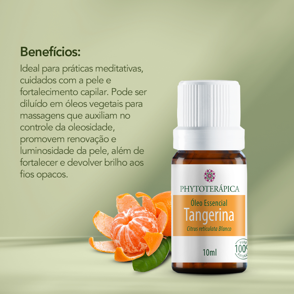 Leveza e alegria com o frescor cítrico da natureza. O Óleo Essencial de Tangerina da Phytoterápica é extraído da casca do fruto Citrus reticulata , conhecido por seu aroma doce e propriedades calmantes. É ideal para aliviar o esforço, melhorar o humor e promover o bem-estar emocional. Também pode ser usado em massagens, auxiliando na tonificação da pele. Sua fórmula é 100% pura, natural, vegana e livre de ingredientes sintéticos. Benefícios: • Ação calmante que alivia o estresse, a ansiedade e a insônia. • Aroma doce e cítrico que eleva o humor e desperta sentimentos de alegria. • Auxilia na tonificação da pele e na redução da retenção de líquidos. • Seguro para uso infantil e excelente para promoção de relaxamento em crianças. • Fórmula pura, vegana e livre de conservantes artificiais. Informações Técnicas: • Volume: 10ml. • Textura: líquida e oleosa. • Uso: aromaterapia, massagens, cuidados com a pele. • Composição: óleo essencial 100% puro de Citrus reticulata . • Método de extração: prensagem a frio da casca do fruto. • Nota olfativa: alta. • Classificação de fragrâncias: cítrica, doce, frutada. • Família: Rutáceas. • Vegano e não testado em animais. • Livre de parabenos, fragrâncias e corantes artificiais. • Marca: Phytoterápica. Ideal para: • Pessoas que buscam relaxamento natural e alívio da ansiedade. • Aromaterapia com foco em bem-estar emocional e leveza mental. • Ambientes infantis e momentos de descontração familiares. • Massagens relaxantes com efeito revitalizante e aroma alegre. Sobre a Phytoterápica: Referência em cosméticos naturais e aromaterapia, a Phytoterápica desenvolve produtos com ingredientes puros, veganos e sustentáveis. Cada fórmula é pensada para promover bem-estar, respeitando seu corpo e o meio ambiente.