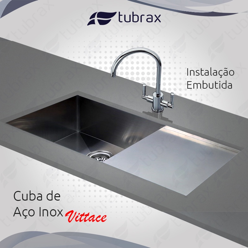 Cuba de cozinha Tubrax Vittace- CAC0005 Produzida em aço Inox 304 de 0,8mm de espessura, dando rigidez e a qualidade necessária para uma cozinha de luxo. Acabamento acetinado escovado linear. Cantos angulados não permitem que a sujeira se acumule. Pintura externa e manta emborrachada conta ruídos é um diferencial das Cubas Tubrax. Acompanham o seguinte acessório: >> Válvula 4 ½” completa - totalmente compatíveis com o uso de trituradores elétricos. Cuba projetada para aplicação SOBREPOSTA ou EMBUTIDA. Obs: Leves alterações na coloração e acabamento podem acontecer entre diferentes lotes do produto. ESPECIFICAÇÃO TÉCNICA: - Marca: Tubrax - Referência do Modelo: CAC0005 - Acabamento: Acetinado escovado linear - Material: Aço Inoxidável - Comprimento: 101 cm - Largura: 51 cm - Profundidade: 23 cm - Furo para válvula de 4½ '' - Peso bruto (com embalagem): 9,5 Kgs - Garantia: 3 meses contra qualquer defeito de fabricação. - Itens inclusos: cuba, válvula 4 ½’