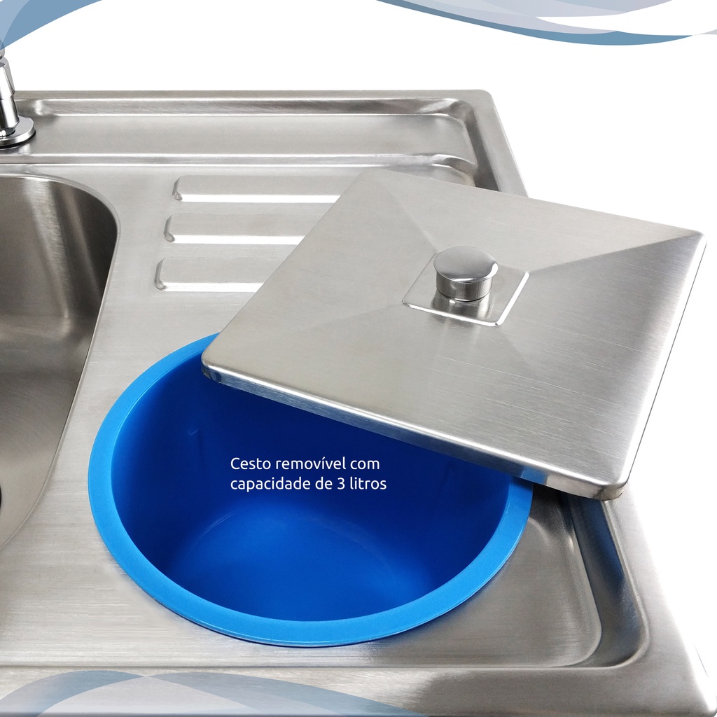 Cuba de cozinha Tubrax com lixeira - CAC0008 Produzida em aço Inox 304 de 0,8mm de espessura, dando rigidez e a qualidade necessária para uma cozinha de luxo. Pintura externa e manta emborrachada conta ruídos é um diferencial das Cubas Tubrax. Acompanham acessórios que auxiliam na preparação e higiene dos alimentos e ainda dão um toque de beleza e requinte ao produto: >> Dosador de sabão com sistema recarrega fácil - não é necessário retirar o reservatório para reabastece-lo. Possuí capacidade de 300 ml; >> Escorredor de pratos projetado para perfeita mobilidade - com capacidade para 4 pratos e talheres, possui encaixe perfeito dentro da cuba, facilitando o enxague. Você também poderá utilizá-lo fora da cuba, pois o mesmo possui apoio para superfícies planas; >> Válvula 4 ½” completa (compatível com a utilização de trituradores. ATENÇÃO: consulte medidas do espelho da válvula do triturador antes que adquirir este produto, visto que a NBR especifica uma variação nas medidas da válvula, sendo que nossa cuba aceita válvulas com espelho de 11cm de diâmetro). >> Lixeira acoplada com tampa, cesto removível e ralo. Capacidade de 3 litros. As cubas Tubrax acompanham ainda uma placa de reforço projetada especialmente para perfeita fixação de torneiras gourmet. Utilizando este reforço, evita-se que a torneira fique mal fixada, dando maior firmeza no seu uso. Só quem é líder na venda de torneiras gourmet também pensaria nessa solução para a sua Cozinha. Cuba projetada para aplicação SOBREPOSTA ou EMBUTIDA. Obs: Leves alterações na coloração e acabamento podem acontecer entre diferentes lotes do produto. ESPECIFICAÇÃO TÉCNICA: - Marca: Tubrax - Referência do Modelo: CAC0008 - Acabamento: Acetinado escovado circular - Material: Aço Inoxidável 304 - Comprimento: 92 cm - Largura: 45 cm - Profundidade: Bojo maior com 17,5 cm / Bojo menor com 15,5 cm - Furo para válvula de 4½ '' - Furo para torneira de 35 mm de diâmetro (lado esquerdo) - Peso bruto (com embalagem): 10 Kgs - Garantia: 3 meses contra qualquer defeito de fabricação. - Itens inclusos: cuba, 2 válvulas 4 ½, dosador de sabão, cesto aramado, placa de reforço, clips para fixação, acessórios para lixeira (cesto removível, tampa, ralo)